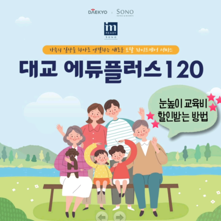 학부모님 안녕하세요 눈높이 남천안교육국입니다 : ) 오늘은 눈높이 교육비 할인도 받고 다양한 프리미엄 서비스를 누릴 수 있는 대교 에듀플러스120 을 소개해드립니다. 대교 에듀플러스 120은 소노 멤버십 서비스에 가입하면서 눈높이 교육비를 매달 지원받을 수 있는 제휴 서비스입니다. 아이 교육비는 매달 고정으로 나가는 비용이다 보니 줄이고 싶어도 방법을 찾기가 쉽지 않죠. 그래서 오늘은 제가 직접 설명하거나, 권유하는 내용은 아니지만 눈높이 교육비를 지원받을 수 있는 방법을 정보 공유 차원에서 정리해보려고 합니다. #대교에듀플러스120 은 생활 멤버십과 교육비 지원이 함께 연결된 방식이에요. 소노 멤버십을 이용하면....... <img src="https://blogthumb.pstatic.net/MjAyNjAxMjNfMTIz/MDAxNzY5MTQ4ODk3NjY5.yRltAwWAYJWauI7rPUL3o4HDukd4mxTnvwQ8ciD8ixgg.LmPH9WPQhR4rzrOwOn-QE036R-ccVpbnaYEYFML_jRYg.PNG/%BF%A1%B5%E0%C7%C3%B7%AF%BD%BA120.png?type=s3" />