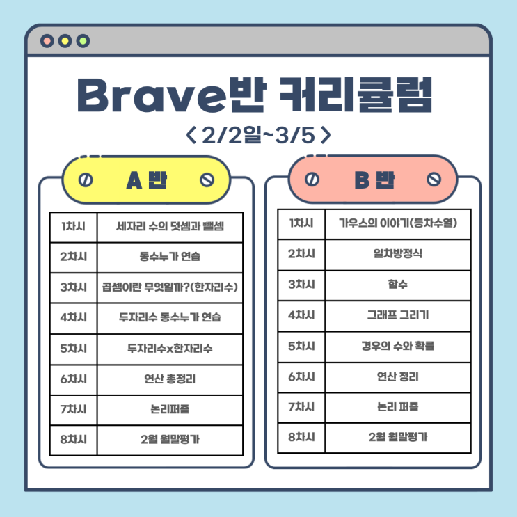 안녕하세요, 생각루트 수학아카데미입니다:) 2026년 새학기에 맞춰 생각루트 각 반의 2월 커리큘럼을 안내해 드리겠습니다. ※ 생각루트의 각 수업은 기초부터 차근히 다지고, 학년을 관통하는 주제별 통합 내용으로 진행됩니다. 궁금하신 점이나 자세한 사항은 카카오톡 오픈 채팅이나 학원으로 연락주시기 바랍니다. 감사합니다!! 생각루트 수학아카데미 (문의) 생각루트 수학아카데미 문의방입니다 ▶️ 수업/컨설팅 관련 문의 ▶️ 개원+입학 관련 문의 ▶️ 개인적 문의 1) 방 입장 후 개인톡, 혹은 2) 오픈프로필 생각루트 수학아카데미 검색 open.kakao.com <img src="https://blogthumb.pstatic.net/MjAyNjAxMjJfMjI0/MDAxNzY5MDgzNjUxODU1.NxbTjBDL47_SBEAA2f-aUl7DU9XPc56nyKZ13niPawEg.-j0WjoIEoYjUp7Z1K1Z4ZkFCqzj0TVU6vL508e1HwM8g.PNG/2-brave.png?type=s3" />
