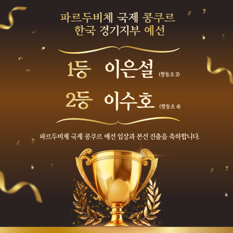 파르두비체 국제 콩쿠르 한국 경기지부 예선 입상 & 본선 진출 소식 셀라피아노에서 기쁜 소식을 전해드립니다. 파르두비체 국제 콩쿠르 한국 경기지부 예선에서 셀라피아노 친구들이 좋은 결과를 거두며 본선 진출이라는 값진 성과를 이루었습니다 예선 결과 안내 1등 이은설 (쌍동초 2) 2등 이수호 (쌍동초 4) https://www.instagram.com/p/DSAcy2JgT5e/?igsh=bjFpaXEwMHl4am03 ⬆️콩쿨 연주 영상입니다. 두 친구 모두 짧지 않은 준비 기간 동안 기초부터 표현까지 차분히 쌓아 올리며 끝까지 포기하지 않고 무대를 준비해 주었습니다. 예선이라는 첫 관문을 지나 이제 한국 본선 무대를 준비하게 된 아이들 이....... <img src="https://blogthumb.pstatic.net/MjAyNjAxMjlfODUg/MDAxNzY5Njg2NTMyMzA1.8Yvl08oPcKFNUOPsWAuRwxrQxi_WVHR7zbVtiZLGkW0g.jB--hfHDiqlLVIfRWXUimfWA7iY3iQtucBWwsVS8ipgg.PNG/%C1%A6%B8%F1%C0%BB_%C0%D4%B7%C2%C7%D8%C1%D6%BC%BC%BF%E4._%2812%29.png?type=s3" />