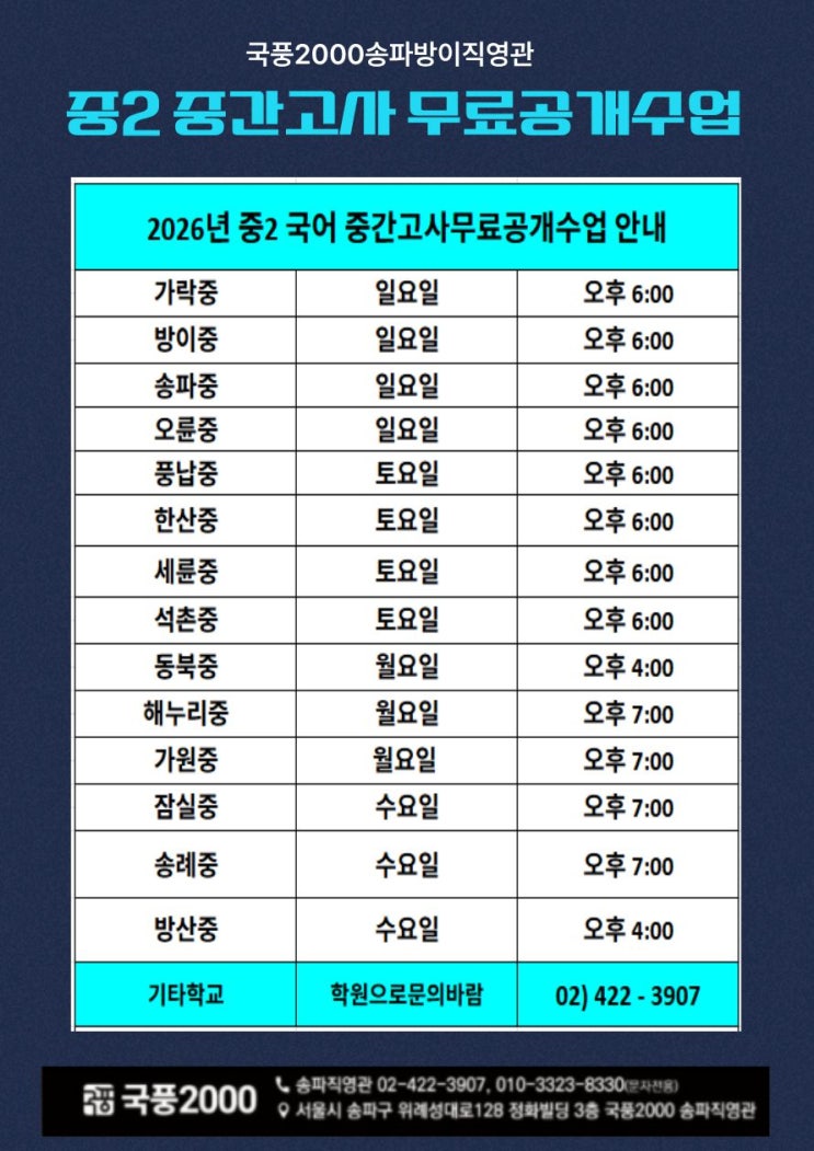 국어 성적, 반드시 첫시험으로 잡아야합니다. 독해력 + 어휘 + 서술형까지 한 번에 학교 내신 완벽 대비 커리큘럼 실제 수업 그대로 체험하는 무료 공개수업 무료공개수업 3/21(토) 무료공개수업 :3/22(일) 무료공개수업 :3/23(월) 지금 경험해보세요, “이해하는 국어”의 차이를! 문의 : 02)422-3907 예약: 010 3323 8330 국어의 시작은 항상 국풍2000입니다!!! 시간을 효율적으로 성적을 수치로 정확하게 국풍2000에서 가능합니다 문의:02)422-3907 예약: 010 3323 8330 국풍2000송파방이직영관 정화빌딩3층 #중등국어 #국어무료수업 #중등무료특강 #국어공개수업 #국어내신대비 #중학생국어 #국어성적향상 #국어학원추천 #중학생공부법 #내신....... <img src="https://blogthumb.pstatic.net/MjAyNjAzMThfMTI5/MDAxNzczODQyNzUwMzE2.PtZXKxMyBCG4QIkvZE7ClwSOVBIqXS5IjXLPnl4Js2wg.tBdK-rWLLmHWaStHPkRITIUnfQys4j5fxbdbZ-3OLacg.JPEG/%C1%DF2.jpg?type=s3" />