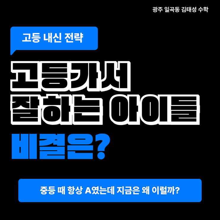 고등학교가서 내신 잘하는 학생들의 수학 공부 비결은? 안녕하세요! 광주 북구 일곡동 김태성 수학학원입니다. 중학교 시절 수학 성적이 우수했던 학생들도 고등학교 진학 후 첫 시험에서 충격적인 점수를 받는 경우가 허다합니다. 학부모님들은 "우리 아이는 중등 때 항상 A였는데 왜 이럴까?" 라며 당황하시지만, 이는 학생의 노력이 부족해서가 아니라 중등과 고등 수학의 근본적인 체급 차이를 간과했기 때문인데요. 고등학교에서도 흔들림 없이 최상위권을 유지하는 아이들은 이미 중등 시기에 고등 수학의 본질을 꿰뚫는 '진짜 공부'를 시작했다는 공통점이 있습니다. 고등학교만 가면 성적이 급락하는 학생들에게서 발....... <img src="https://blogthumb.pstatic.net/MjAyNjAyMTlfNDgg/MDAxNzcxNDczMTkxNDEx.nP5_EEhAlyog7ke613jbeZ428vSYoCi1jSMNnyhrzvIg.wILynZZ_GvoHFpAbsm_LRET9kbqd-_PehZhtSYKk61Eg.PNG/%B1%E8%C5%C2%BC%BA_%BC%F6%C7%D0_138.png?type=s3" />