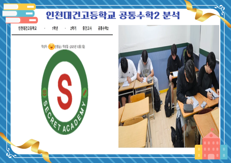 시크릿아카데미학원의 수학 고등부 전임 성 선생님께서 공통수학 2 기말고사 대비를 위한 인천대건고등학교 중간고사 기출을 심층적으로 분석해 주셨어요. 이를 바탕으로 기말고사에서는 실수 없이 모든 학생들이 성적 향상을 기대하면서 올려봅니다. 총평 및 학습전략 이번 인천대건고등학교 공통수학 2 시험은 고등학교 1학년 2학기 중간고사로, 출제 범위는 평면좌표부터 집합까지입니다. 출제는 교과서 기본 개념을 바탕으로 하되, 고난도 모의고사 및 심화 문제를 상당 부분 변형하여 출제했습니다. 또한, 전체 난이도는 상이었습니다. 어려운 4개의 문제는 학교에서 마지막에 나누어 준 학습지에서 많이 반영이 되었습니다. 다만, 원본 문....... <img src="https://blogthumb.pstatic.net/MjAyNTEyMDVfMTcg/MDAxNzY0ODkwOTcwMDUy.BV1_6EmH0crmAEe7tPYy4hRNOnYTqQ9zpRT-dlfUuG4g.jXbkzrQKdNupejJQdbZpAS74KLgZEkjrhRCA4N-2Secg.PNG/%B4%EB%B0%C7%B0%ED%BC%F6%C7%D0-2.png?type=s3" />