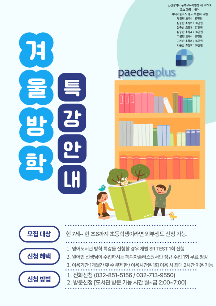 인천광역시 동부교육청 제 2877호 교습과목 : 영어 페디아플러스 송도브랜치 학원 안녕하세요! 페디아플러스 송도브랜치 입니다! 다가오는 겨울방학, 외대어학원 개원 10주년을 기념하며 [2025겨울방학 영어도서관 특강]을 오픈합니다! 기존 페디아플러스 송도브랜치 영어도서관은 외대어학원 재원생만 이용이 가능했는데요! 이번 겨울방학 기간 동안에는 외부생도 초등생이라면 누구나 영어도서관을 이용할 수 있도록 [2025겨울방학 영어도서관 특강] 을 준비했습니다. 10주년 기념 이벤트도 준비했으니 끝까지 봐주세요!! [초등 겨울방학 영어도서관 특강 안내] ✔ 대상 : 현 7세 ~ 현 초6까지 초등학생이면 누구나!~ ★ 외부생도 해당 학년이....... <img src="https://blogthumb.pstatic.net/MjAyNTEyMDVfOSAg/MDAxNzY0OTIwNTYwNzEx.RDc0NwmcyrN2TTrnLLsDJnVbNEhhCbD_b3klpruCxsog.p2OqKnj9Wj8HqVsy02oxQyzWCtKOiFIapYLNbddsTx4g.PNG/%B0%DC%BF%EF%B9%E6%C7%D0-%BD%C5%C3%BB-%BE%C8%B3%BB%B9%AE-001.png?type=s3" />