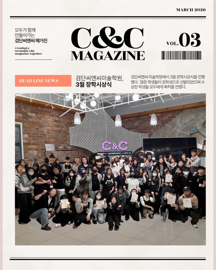 안녕하세요~ 인천 서구 검단신도시 검단미술학원 검단C&C미술학원 단이입니다! 오늘은 장학시상식에 대해 소개하고자 합니다. 검단씨앤씨 미술학원에서는 매달 장학시상식이 진행되고 있는데요. 무슨 장학시상식인가요? 지각 결석하지 않은 모범적인 학생! 한달동안 실기력이 많이 상승한 학생! 친구에게 검단씨앤씨미술학원을 소개한 공로장학생 친구에게 검단씨앤씨미술학원을 소개받은 추천장학생 을 선정하는 장학시상 행사입니다! 붓 바꾸고 싶은데.. 물감도 더 채워야 해.. 용돈이 부족하다면..? 걱정하지 마세요! 장학생으로 선발된 학생들에게는 미술 재료를 구매할 수 있는 포인트가 지급됩니다. 그럼 3월 장학시상식을 함께 보....... <img src="https://blogthumb.pstatic.net/MjAyNjAzMTNfNDEg/MDAxNzczMzgyNzI4OTM0.DpWFt_x9_MF16F2d1TgFG3AdeGrFF50n-E-56R3c-oIg.rqZie7w7KTVxbONEvkrKmVsIt4g1qBOvj5oi-BgIf64g.JPEG/3%BF%F9%C0%E5%C7%D0_%281%29.jpg?type=s3" />