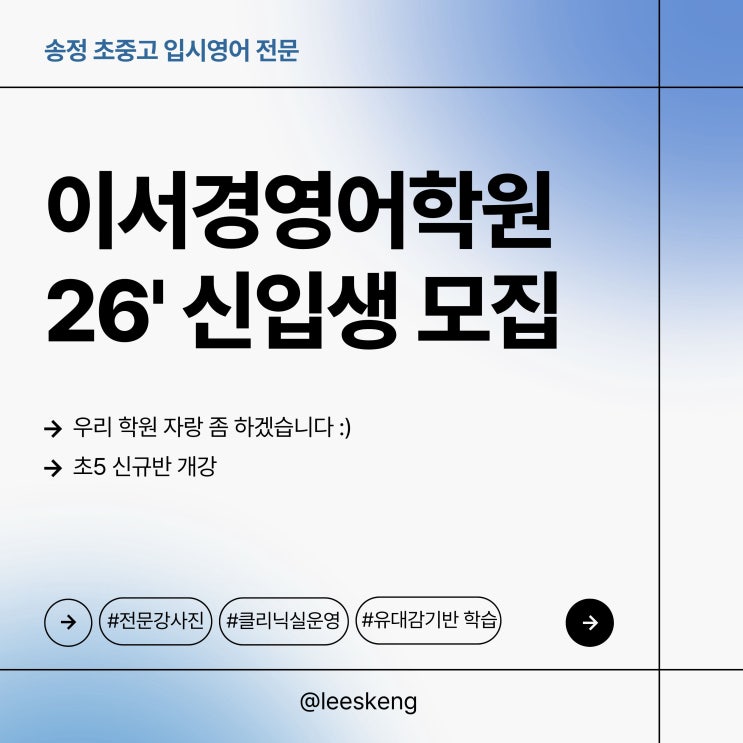 안녕하세요 ! 이서경쌤 입니다 :) 2025년 열심히 달려온 우리 학생들 고생하신 학부모님들 그리고 우리 선생님들께도 큰 박수를 보냅니다 !! 2026년 1월 12일 개강하는 초5 신규반 안내드립니다. 고등부까지 바라보는 입시학원은 초등부 학습목표도 분명 달라야 한다고 생각합니다. 저희 학원의 강점과 학습목표 긴 글이지만 꼭 한번 읽어봐 주세요 :) 교육 문의는 아래 원장 직통번호로 부탁드립니다. 감사합니다 :) ☎️ 010-5797-1981 ☎️ *교육청신고 5830호* 초등A 23만 / 초등B 25만 / 중등A 25만 / 중등B 27만 / 고등 30만 / 초중고 특강 17만(2개월 수강 7만원 할인) (교육홍보게시물 법을 준수하는 글입니다.) <img src="https://blogthumb.pstatic.net/MjAyNTEyMjNfMTE0/MDAxNzY2NDk1Njc4NjM1.s_auKhowPkRu0VQdu3PAIGqiAhSXVXxhNYu0s509x5Qg.QtzS1gL4J2nbDbB9sTDO81w89hOL9SDoiZcMAj8aHhEg.JPEG/1.jpg?type=s3" />