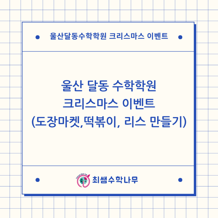 울산 달동 수학학원 크리스마스 이벤트 (도장마켓, 떡볶이, 리스 만들기) 안녕하세요. 울산최쌤입니다. 크리스마스를 맞아 아이들과 함께 조금 특별한 하루를 보냈습니다. 도장으로 만든 크리스마스의 하루 – 도장마켓 & 크리스마스 리스 만들기 활동 그동안 수업 시간마다 차곡차곡 모아 두었던 도장으로 기다리고 기다리던 도장마켓을 열고, 따뜻한 떡볶이 간식 시간, 그리고 양말목을 활용한 크리스마스 리스 만들기까지 아이들이 정말 좋아했던 하루였어요. ️ 열심히 모은 도장으로 여는 도장마켓 수업에 성실하게 참여하고, 과제를 잘 해낸 만큼 하나씩 모아 온 도장들. “이걸로 뭘 바꿀 수 있을까?” 수학나무 친구들....... <img src="https://blogthumb.pstatic.net/MjAyNTEyMjVfMTM1/MDAxNzY2NjY1OTQ0NTgw.f_AoXIjudHyDRkgR-7h5kVu9F-sGangbTl2e-7pwygQg.VEugnkmSPcZiwtXnIUvWyH_7-8UaQNK4BS75AmnQ_cgg.PNG/%C3%D6%BD%DC%BC%F6%C7%D0%B3%AA%B9%AB_%286%29.png?type=s3" />
