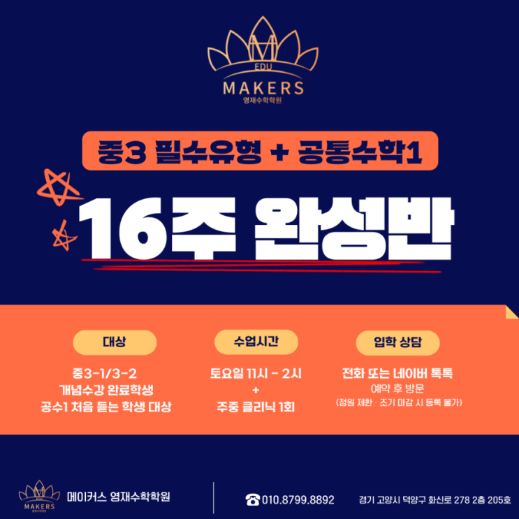 중3 필수유형 + 공통수학1 16주 완성반 개강 ✔ 고등수학 시작 전 반드시 잡아야 할 공통수학1 핵심 유형 정리 ✔ 중3에서 고등수학으로 넘어가는 가장 중요한 과정 ✔ 개념 → 필수유형 → 실전 문제까지 16주 완성 커리큘럼 대상 : 중 3-1 / 3-2 개념수강 완료학생 공통수학1 처음 듣는 학생 기간 : 16주 완성 내용 : 공통수학1 필수 개념 + 유형 집중 훈련 고등수학 시작 전, 공통수학1을 확실하게 완성하세요! 문의 및 상담 환영합니다. <img src="https://blogthumb.pstatic.net/MjAyNjAzMTdfMTA1/MDAxNzczNzEwMjYxNTYz.oUPgOKR4mAfy-Bb2pngFxIN2pzKBAztxi0jqXwq18KYg.EL9336BhyHcZulXDXGHtQnTk7h59r9Zy_x7UdCdXR4Ig.PNG/900%A3%DF1773710243829.png?type=s3" />