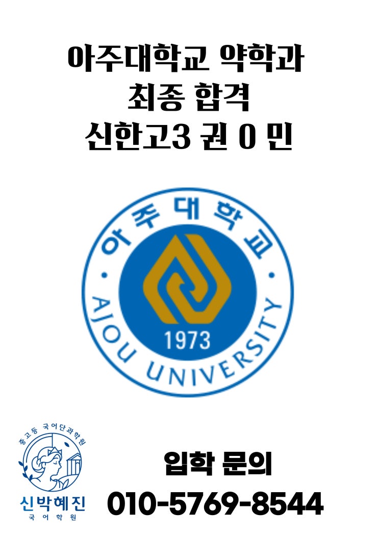 늘 한 발 빠른 평택 국어의 자부심, 국어는 저희가 가장 잘합니다. 신박혜진 국어학원입니다. 개원 후 세번째 입시를 무사히 마쳤습니다. 재원생 여러분들, 전국의 고3 수험생 여러분들 수고 많으셨습니다! 권0민 학생의 아주대학교 약학과(약학과 2관왕) 최종 합격을 진심으로 축하드립니다. 올해와 마찬가지로 신박혜진 국어학원은 5월 31일 이후 고3 신입생을 모집하지 않습니다. 재작년에는 서울대, 작년에는 연세대 약대, 올해는 고려대 내년에는 여러분이 주인공입니다. 학생의 대학을 바꿀 마지막 기회, 놓치지 마세요. 가고 싶은 학교를 갈 수 있도록 돕는 학원이 되겠습니다. <img src="https://blogthumb.pstatic.net/MjAyNjAzMThfMTQz/MDAxNzczODI5NzE3MDU2.U4bE3DyUnSeY5Ye7j4UKhE9bP2VNjUhgiS4XpZzreXkg.8GZxwDwhOHegjcwwcH-UH-X6raROzQwcCsUTh5adMm8g.JPEG/015.jpg?type=s3" />