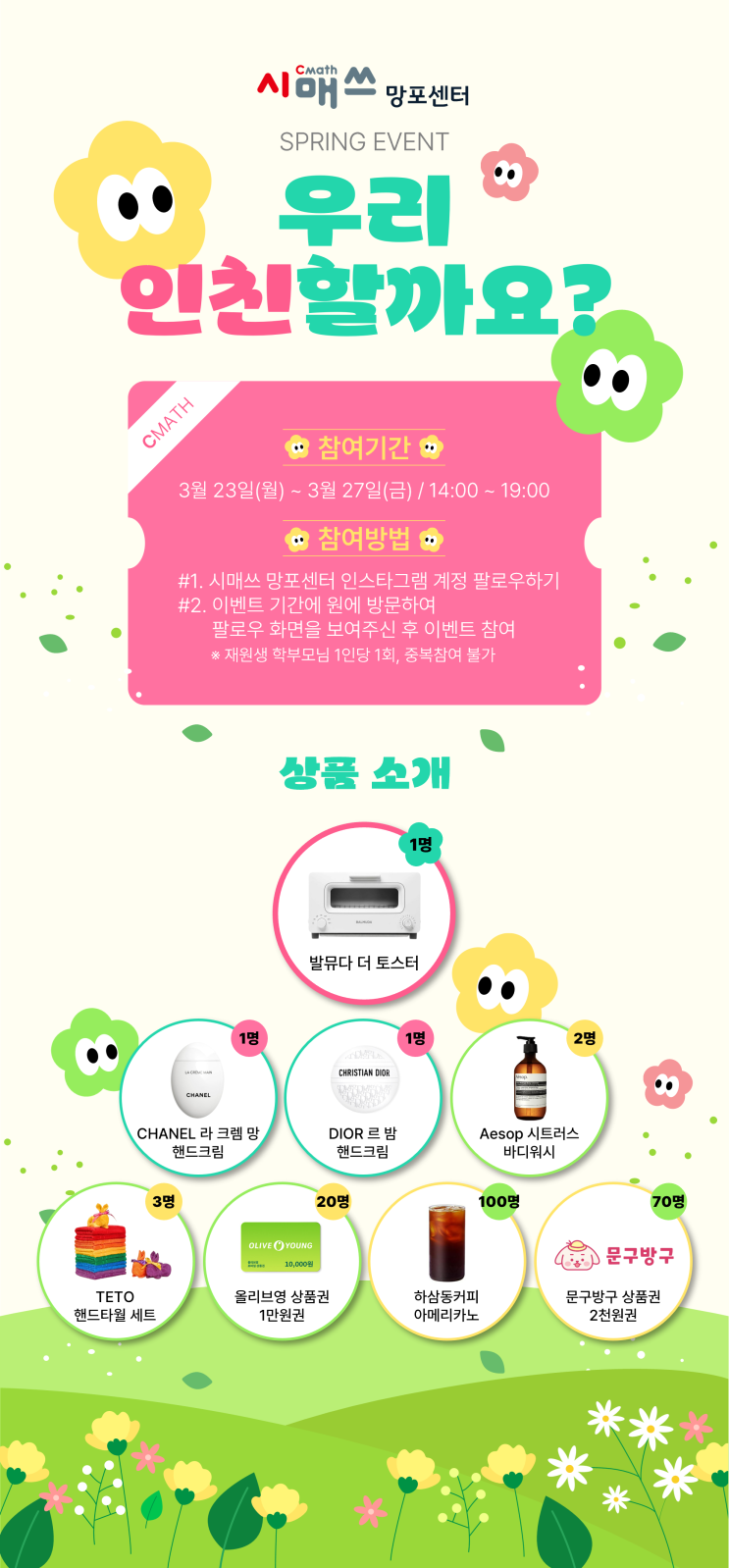 안녕하세요 시매쓰 망포센터 입니다. 3월, 새학기가 시작되며 아이들 준비로 바쁘게 보내셨을 학부모님들을 위해 작은 이벤트를 준비했습니다. 망포센터 인스타그램 계정을 팔로우하시고 원에 방문해 팔로우 화면을 보여주시면 다양한 상품이 준비된 이벤트에 참여하실 수 있습니다. 매년 3월 새학기를 맞아 진행하는 행사로 학부모님들께 작은 즐거움이 되었으면 하는 마음으로 준비했습니다. 망포센터 인스타도 팔로우하시고 준비된 선물과 함께 작은 즐거움도 받아가세요 <img src="https://blogthumb.pstatic.net/MjAyNjAzMTdfMTE0/MDAxNzczNzE5NDk0OTA1.sruxONiHPCXzzIe55lK8qEGj6y_Ox-uVRUbaW99h4D8g.O-B0feIiqpF1GMXVFLbnjnaZa3_lUqA-5bwnRbSGYVwg.PNG/KakaoTalk_20260316_213916720_01.png?type=s3" />
