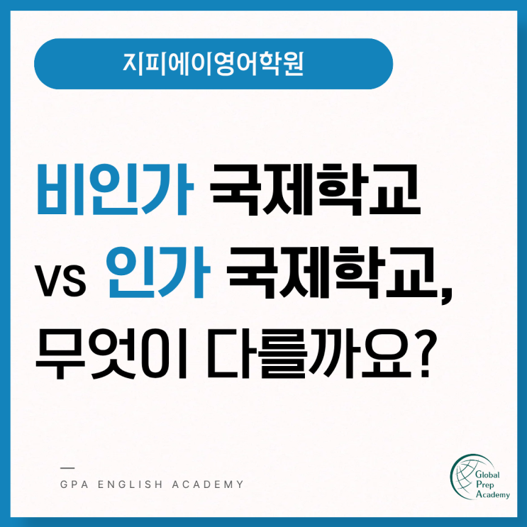 비인가 vs 인가 국제학교 무엇이 다를까요? 반갑습니다. 지피에이영어학원 원장 정승주입니다. 학부모님들과 상담을 하다 보면 비인가 국제학교 진학에 대해 고민하시는 분들이 계세요. 옆 반 친구는 비인가 국제학교를 준비한다던데, 정확히 무엇인지 궁금하기도 하고, 혹시 우리 아이한테도 필요한 것은 아닌지 생각이 많아지셨을 겁니다. 검색창에 정보는 많지만, 정작 우리 아이에게 맞는 방향인지에 대한 결정은 쉽게 내리기 어렵죠. 그래서 오늘 글에서는 비인가 국제학교의 정확한 의미와 인가 학교와의 차이점에 대해 하나씩 말씀드리려고 해요. 잠시만 시간 내어 읽어주시면 자녀의 진로 방향을 결정하시는 데 도움이 되실 거라 생각합....... <img src="https://blogthumb.pstatic.net/MjAyNjAyMjRfMTI1/MDAxNzcxOTM3Mzk2MTA5.mGzwRl3zZByxwrvM4oidlOmXyCJ1BNlxhJjqFyHkt2gg.x3ocplAPb9ciA5RA2xBl5Io5FBdPw6MTxNcGBaBImZ4g.PNG/1.png?type=s3" />