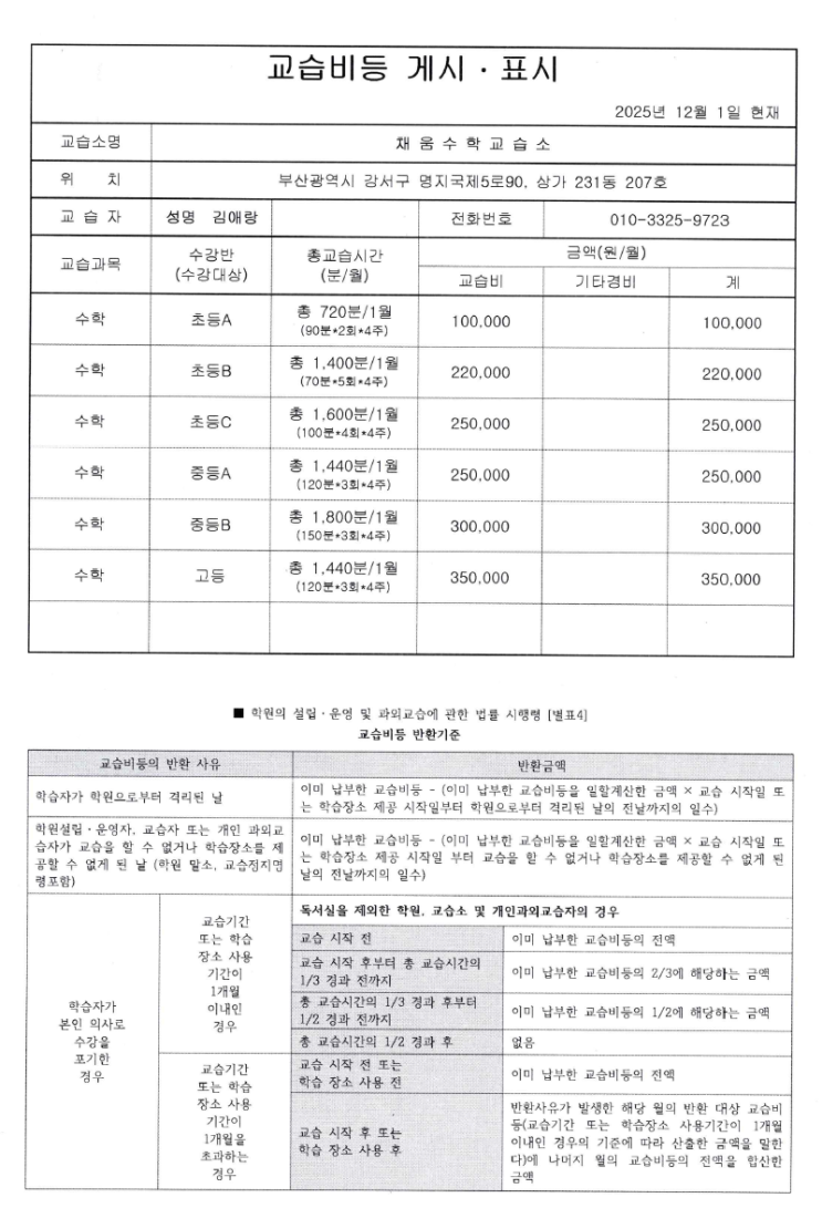명지동 수학학원 채움수학 교습소 수강료 안내.