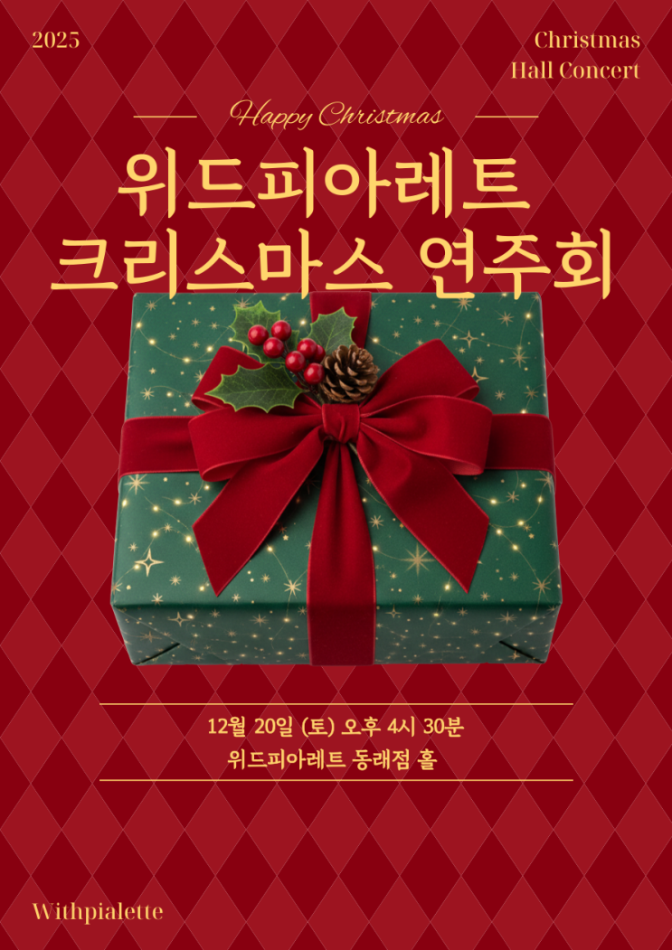 안녕하세요 위드피아레트 동래점입니다 ! 벌써 크리스마스를 한 주 정도 앞두고 있는데요 - 벌써 크리스마스가 코 앞이라 너무 설레는 나날들이네요 ! 다들 크리스마스 주간에 즐거운 계획 있으신가요 ㅎㅎ 역시 연말에는 소중한 분들과 함께하는 일정으로 따뜻하게 보내는 행복만큼 좋은 게 없죠 ! 저희 위드피아레트 동래점에서는 연말과 크리스마스를 맞아 동래점의 홀에서 연주회가 열릴 예정이랍니다. 따뜻하고 쾌적한 저희 위드피아레트 동래점의 홀에서 진행하는 연말 연주회에 찾아주신다면 분명 기억에 남는 따뜻한 연말이 되실거예요 ! 12월 20일 이번주 토요일, 오후 4시 30분 저희 위드피아레트 동래점 홀에서 진행되는 연말 연주회....... <img src="https://blogthumb.pstatic.net/MjAyNTEyMTVfNjMg/MDAxNzY1Nzc4NzAxMzMw.6E3pIzJeXhe-YD-1NFQCzSZ1gNzigx3QvOUUi0fDqB8g.RGa5MBgkUwaAxwQ_BR5HJxT4hADxgsXQmPIhJV9EqDwg.PNG/%C1%A6%B8%F1%C0%BB-%C0%D4%B7%C2%C7%D8%C1%D6%BC%BC%BF%E4__%282%29.png?type=s3" />