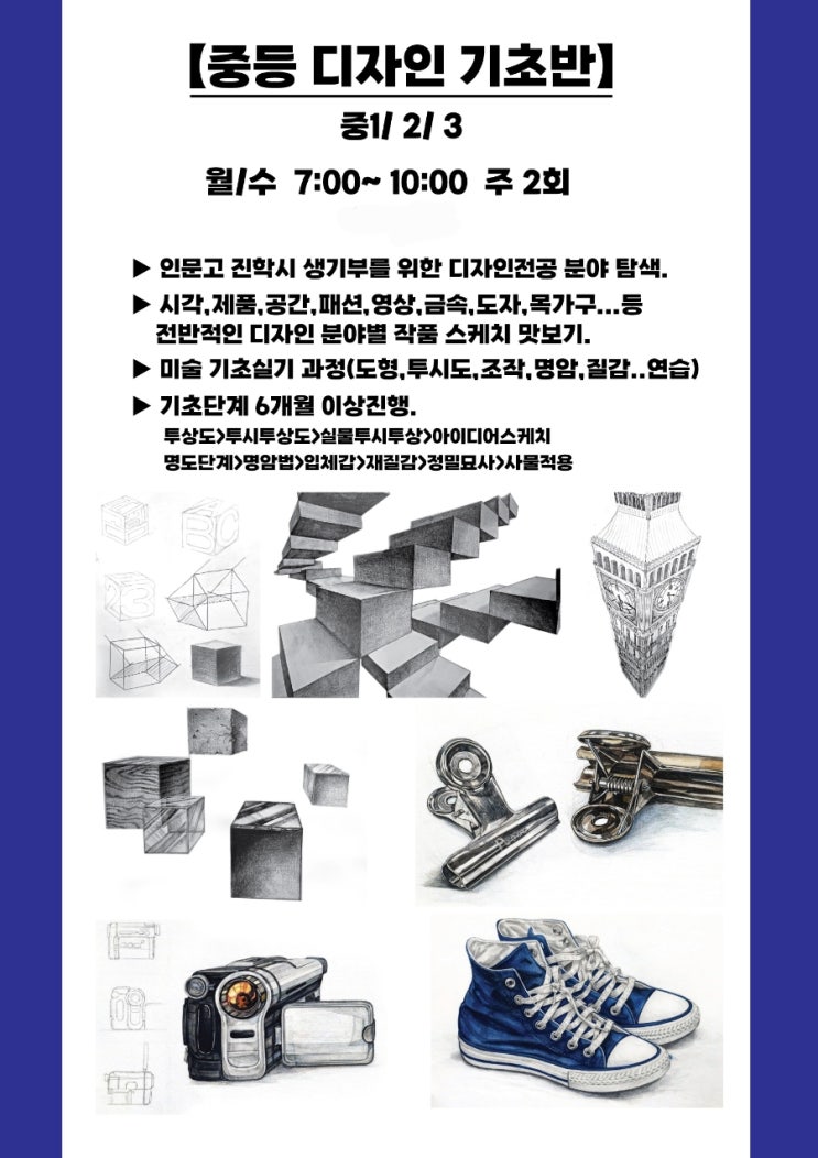 안녕하세요 아트피플입니다 오늘은 디자인에 관심 있는 중등부 친구들을 위한 디자인 기초 수업을 안내드립니다. 본 수업은 기초디자인 · 기초조형 · 기초소양평가 등 디자인 입시를 준비하는 학생들을 위한 기초 단계 프로그램입니다. ✏️ 수업 내용 스케치 중심 수업 투시도 이해 및 사실 표현 아이디어 발상과 전개 연습 기초 단계의 투상도·사실표현 수업 이후, 아이디어 전개 및 디자인 스케치를 차근차근 진행합니다. 또한, 고교 진학 시 활용 가능한 학교생활기록부 및 미술활동 대비를 위해 디자인 분야별 탐구 활동을 목적으로 한 수업입니다. 수업 일정 요일 : 화 / 목 시간 : 오후 7시 ~ 10시 (3시간) 대상 : 중학교 1 · 2 · 3학....... <img src="https://blogthumb.pstatic.net/MjAyNTEyMTlfMjgx/MDAxNzY2MTQ5MzUyMzc2.icnT0TKRXOE2kJqPriz8CmWWIoK_TveKf5sAs-89k94g.zCP0Q76finlbt9spub15sl3DhLb_kpEwHW1InKtYRR0g.JPEG/900%A3%DF2%A3%DF964%A3%DF1765952676875.jpg?type=s3" />