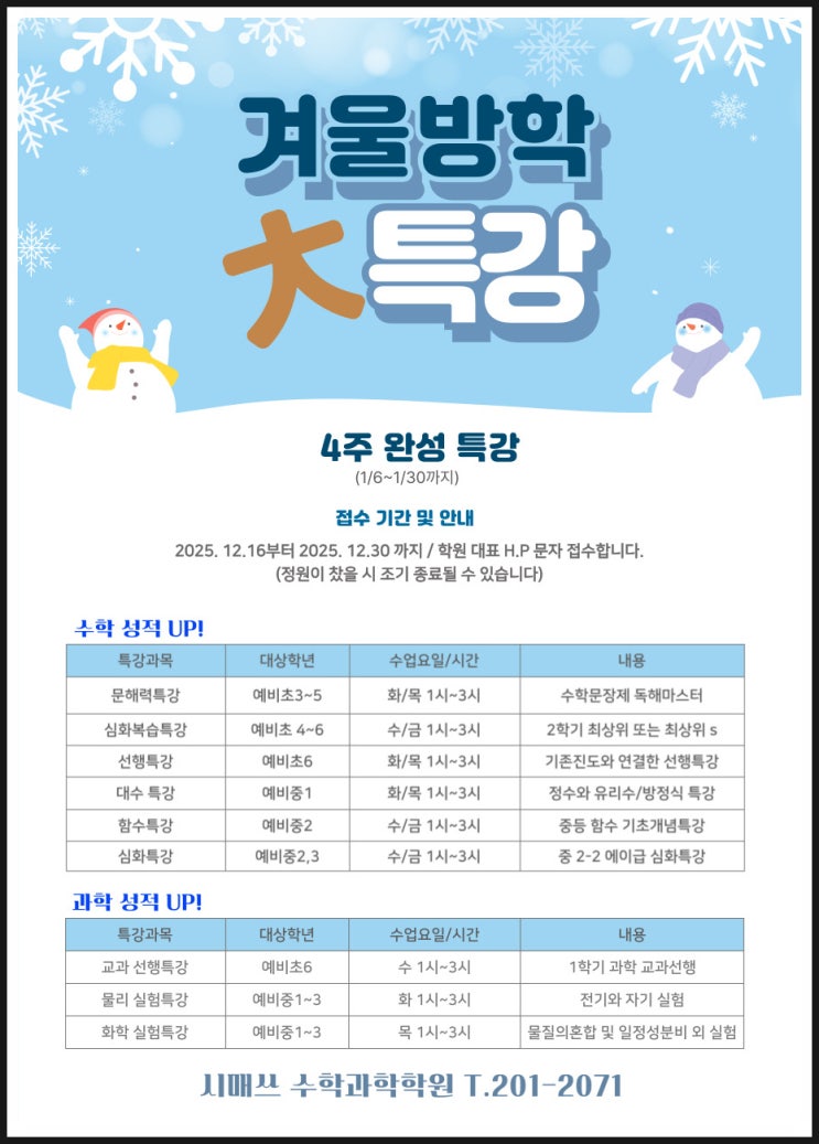 안녕하세요~? 벌써 25년도 열흘정도 밖에 남지 않았네요~ 바쁘게 지내오다 보니 벌써 한해가 다 가고 또다시 내년을 준비하는 겨울방학이네요. 겨울방학을 어떻게 보내느냐는 한 해 농사를 지을 준비를 하는 것과 같습니다. 풍요로운 결과를 위해 올 겨울 방학 한걸음 더 도약할 수 있는 밀도있고, 의미있는 시간을 보낼 수 있도록 시매쓰 수학과학학원이 돕겠습니다. 자세한 사항은 원으로 문의바랍니다. 감사합니다. <img src="https://blogthumb.pstatic.net/MjAyNTEyMjBfNyAg/MDAxNzY2MjE4MDgyNzk5.zJ6lR8dRozziEMsJFoQLpiXjCwfEobwxpMVWC372O8Mg.cqnxbyM4rvyVrEIoU6CvoJLazU644ahQKRHTSTrbO0og.JPEG/%B0%DC%BF%EF%B9%E6%C7%D0_%C6%AF%B0%AD%BE%C8%B3%BB%B9%AE_%282%29.jpg?type=s3" />