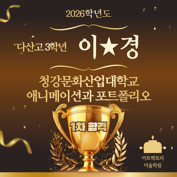 안녕하세요, 아트팩토리 미술학원입니다. 2026학년도 입시가 한창인 지금, 가슴 뛰는 기쁜 소식을 전해드립니다! 우리 학원에서 청강문화산업대학교 애니메이션 스쿨 면접전형 1차 합격생이 배출되었습니다! 혹시 올해 청강문화산업대 합격 소식이 없어 의아해 하던 학부모님, 학생들이 있을 것이라 생각합니다. 올해는 긴~ 추석 일정으로 인하여 대학교 수시 실기 일정이 유난히도 많이 겹쳤습니다. 이러한 점을 반영하여 올해 청강대는 면접전형에 힘을 실어 포트폴리오 제작에 주력하였습니다. 14:1 이라는 치열한 경쟁률을 뚫고 1차 합격의 문을 연 우리 학생들 정말 자랑스럽습니다! 이번 합격이 단순한 우연이 아닌 이유! 아트팩토리....... <img src="https://blogthumb.pstatic.net/MjAyNTEyMDFfMTkx/MDAxNzY0NTkyNjEzNDc2.aJe_l9j4zp6rFlTZXb_cjV1j7zYVmyE871syETfjcOQg.-Qhfq7TzXrCIG6KDsXyCzj8XV2hbZ59akBn1LyiIWi8g.JPEG/010.jpg?type=s3" />
