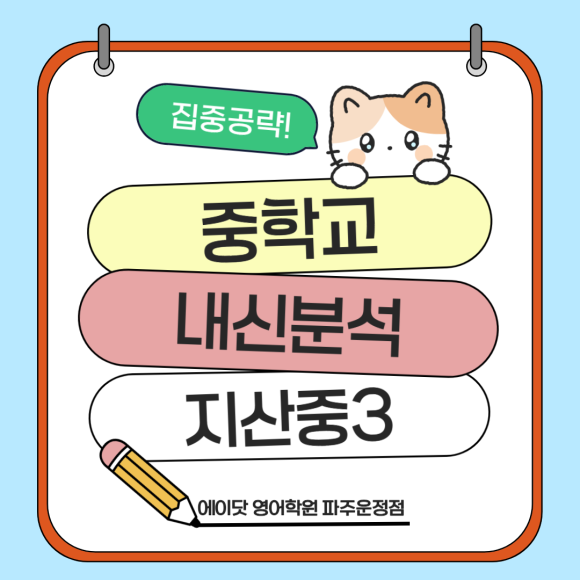 안녕하세요! 에이닷 영어학원 파주운정점 입니다! 오늘은 다음 시험을 꼼꼼히 준비할 수 있도록 지산중학교 3학년 1차 지필평가 분석 리포트를 가져왔습니다! 우리 지산중 친구들~! 시험보느라 수고 많았습니다! 에이닷 영어학원 파주운정지점은 매 시험마다 학교, 학년별 시험지를 취합해 분석하고 이를 바탕으로 내신 분석 리포트를 작성하고 있습니다 학교마다 시험에서 중요하게 생각하는 포인트가 다르기 때문에 이렇게 분석해서 리포트를 작성해 두는 것은 다음 시험을 위해 꼭 필요한 과정 중 하나입니다! 이제 본격적으로 내신 분석을 해볼까요? 출제범위 2025학년도 1학기 1차 지필평가 범위입니다 이번 1학기 중간고사는 교과....... <img src="https://blogthumb.pstatic.net/MjAyNjAyMjZfMTU3/MDAxNzcyMDk2Njk4OTEx.gU0KnJ1urx6nxTQ4zaWSfYN-Q1_W5caEWMpij4pspqcg.yyT9ttdsrlGSau_xlzM6OcZ1bo-scSC9gBHph4ot140g.PNG/%BA%ED%B7%CE%B1%D7_%C4%AB%B5%E5-005_%282%29.png?type=s3" />