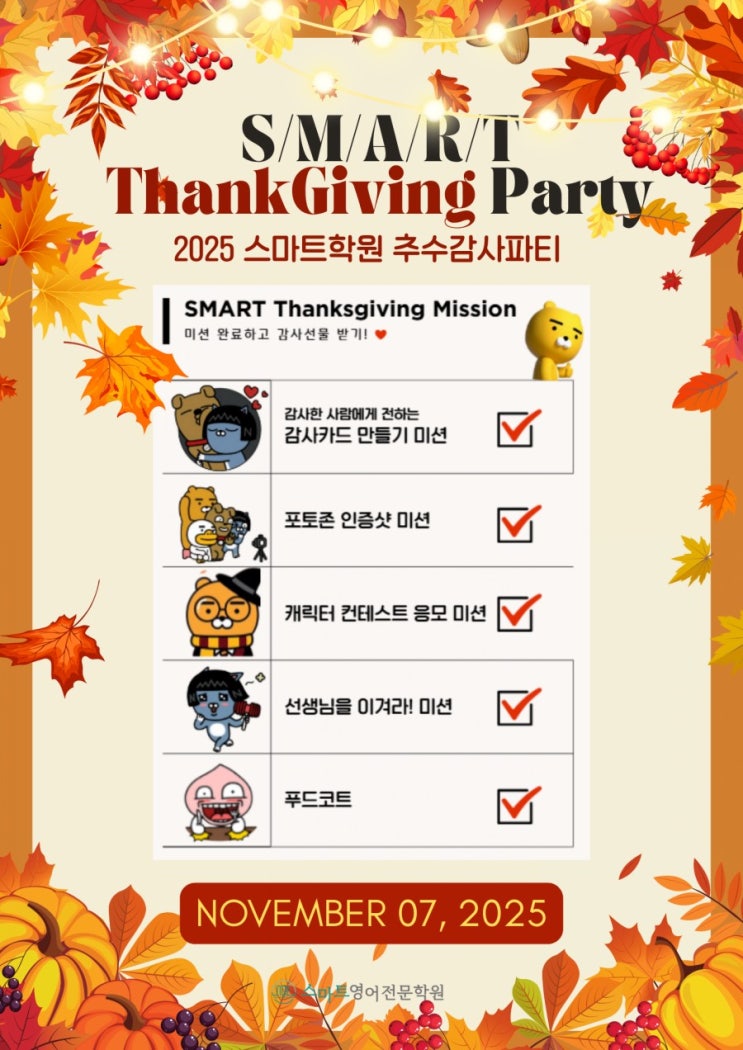 안녕하세요. 스마트학원입니다. 매년 가을이 되면, 많은 곳에서 할로윈 행사를 진행하지만, 저희 스마트학원은 조금 다른 시간을 보냅니다. 바로 추수감사절(ThanksGiving Day)을 주제로 우리 아이들과 함께 '감사의 의미'를 되새기는 특별한 시간을 가지는 것입니다. 한 해 동안 있었던 감사한 일들을 떠올리고, 고마웠던 사람에게 마음을 전하며 아이들이 스스로 감사의 의미를 다시 느껴볼 수 있는 시간입니다. 본 행사는 아이들이 적극적으로 참여할 수 있도록 작은 미션들로 꾸며졌습니다. 감사카드 만들기 미션 선생님을 이겨라 랜덤게임 미션 캐릭터 컨테스트 포토 미션 세 가지 미션을 모두 완수한 친구들....... <img src="https://blogthumb.pstatic.net/MjAyNTExMjBfMjQg/MDAxNzYzNjA3NTI4NDM5.ZDiLAEd_ZDsm9DKEclSadwy0xh9PJgq1izHOCNO1uWcg.t0pHBanF6jCevrzNt0-1tnWRo7H7WxrjY7JqGdsyYVsg.JPEG/1763607527811.jpg?type=s3" />