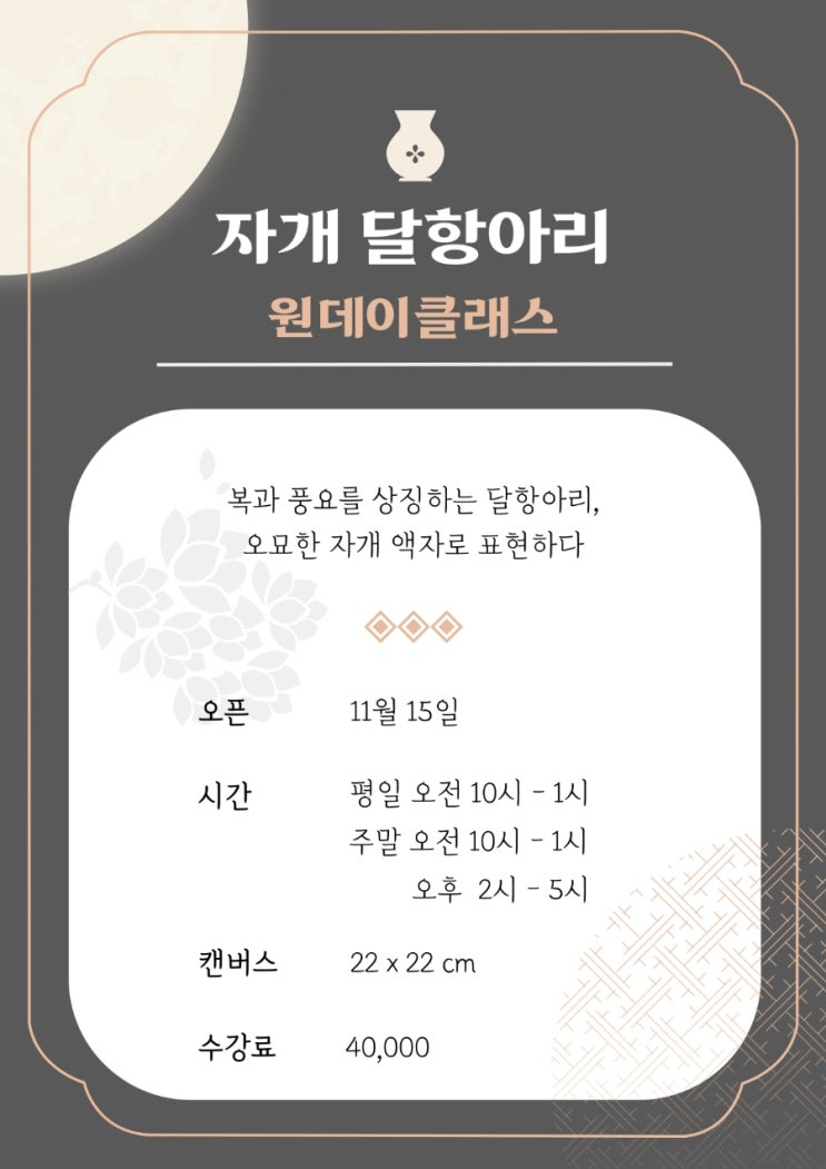 복을 담은 달항아리 11월 15일부터 자개 달항아리 원데이클래스를 오픈합니다! 평일 오전과 주말 오전/오후 시간대를 예약하여 수강하실 수 있습니다. 22×22cm 사이즈 캔버스에 달항아리를 그리고 자개 조각을 붙이는 과정으로 진행합니다. 수업 시간은 3시간이며, 수강료는 40,000원입니다. 오픈 기념 11월 30일까지 10,000원 할인을 적용해드리고 있습니다. 집에 달항아리 액자 하나 어떠신가요? 문의 010.8850.4493 <img src="https://blogthumb.pstatic.net/MjAyNTExMTJfMjgy/MDAxNzYyOTQyMzU0ODA3.UR9IbYfjimghaT2pT1oCT7xSAv-dGe-Kw9JoAapQk70g.GyGOrvk7YCnsidFGutadqUpDrqHe9p_23BDoarSMLuwg.JPEG/900%A3%DF1762929732716.jpg?type=s3" />