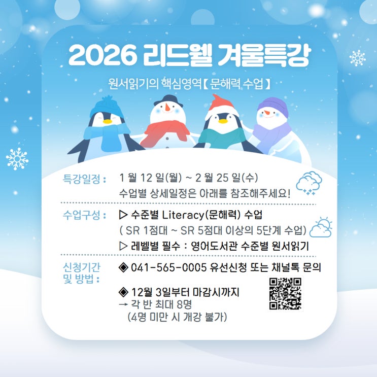 안녕하세요. 리드웰영어도서관어학원입니다! 리드웰 영어도서관은 변화하는 한국 영어교육(읽기·쓰기 중심 평가)에 맞추어 초·중등 학생들에게 가장 중요한 문해력 기반 원서 수업을 겨울특강으로 준비했습니다. 수많은 영어학원과 방대한 교육 정보 속에서 부모님들이 가장 불안해하는 질문은 두 가지입니다. “원서가 중요하다는 건 알지만, 어떻게 시작해야 할지 모르겠어요.” “원서로 배우면 정말 영어실력이 늘까요?” 리드웰은 이 불안을 해결하는 체계적인 리딩 레벨 진단과 원서·문해력 시스템을 제공합니다. 겨울특강 핵심 구성 개별 리딩 레벨 정확 진단 수준별 원서읽기 및 북 큐레이션 문해력·어휘·표현력을 키우는 읽기 수업....... <img src="https://blogthumb.pstatic.net/MjAyNTEyMDRfMTcg/MDAxNzY0Nzc4NTQxMTA0.BSMMknv-bIunQxtyjV1y091X0o_uapA2O3sTLqeryO8g.6112CGrWG6D9ghzPTgLjXM_sM0ukCT--s0MBlUUf8Xgg.JPEG/%B0%DC%BF%EF%C6%AF%B0%AD_%BE%C8%B3%BB%B9%AE_1.jpg?type=s3" />