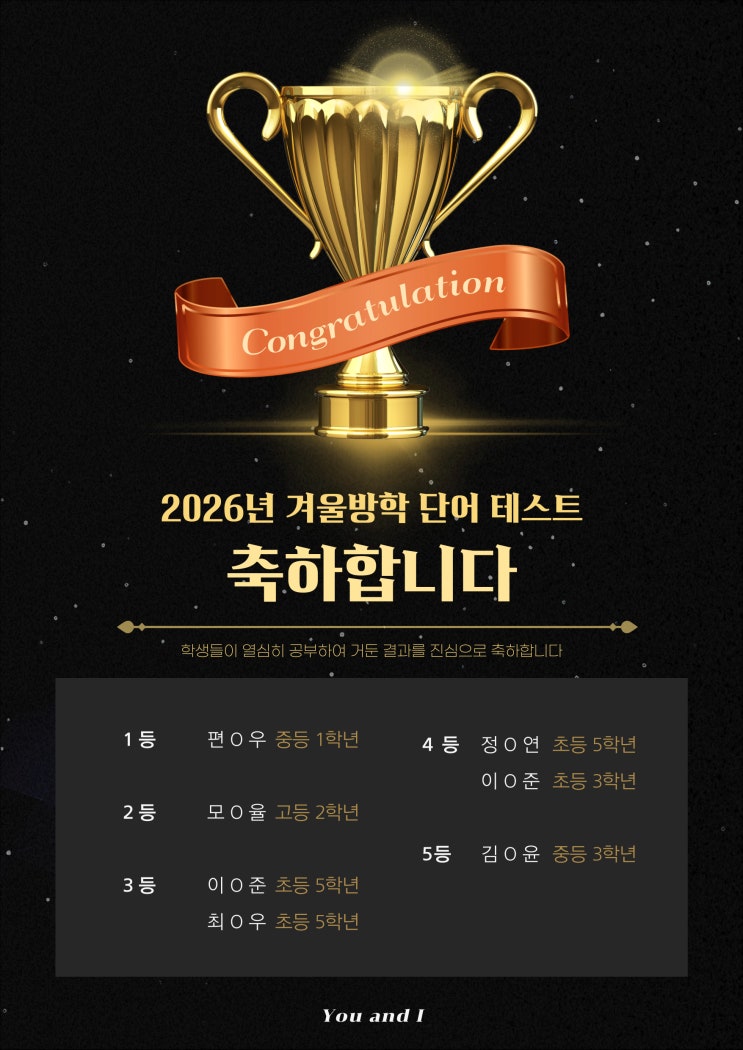 #보령영어 #유앤아이잉글리시 안녕하세요! 꼼꼼한 영어로 꼼꼼한 습관을 만드는 유앤아이잉글리시 입니다. 겨울방학 단어 우수자 발표 겨울방학 동안 열심히 단어를 외운 모든 학생들 정말 수고 많았습니다 이번에 받지 못한 학생들도 다음에는 꼭 받을 수 있도록 더 열심히 도전해 봅시다 1등 (5만원) - 편*우 2등 (4만원) - 모*율 3등 (3만원) - 이*준 / 최*우 4등 (2만원) - 정*연 / 이*준 ️5등 (1만원) - 김*윤 ⤿ 상담문의 : 아래 카카오톡 채널로 연락 주시면 더 빠른 상담이 가능합니다 :) https://pf.kakao.com/_urxcDxj/chat ⤿ 유앤아이 잉글리시 인스타그램 https://www.instagram.com/youandi....... <img src="https://blogthumb.pstatic.net/MjAyNjAxMjlfMjYw/MDAxNzY5NjU0MjIyMjEy.5H07LyEgDdc4Pnv79ub2RDDe1gMxq1D55VphfHllKoEg.Oj6Sv3R9l2FZ-nIrhd2zj5RI7ZlKABQi6UvJr2LcQd0g.JPEG/%C0%E5%C7%D0%B1%DD-001_%281%29.jpg?type=s3" />
