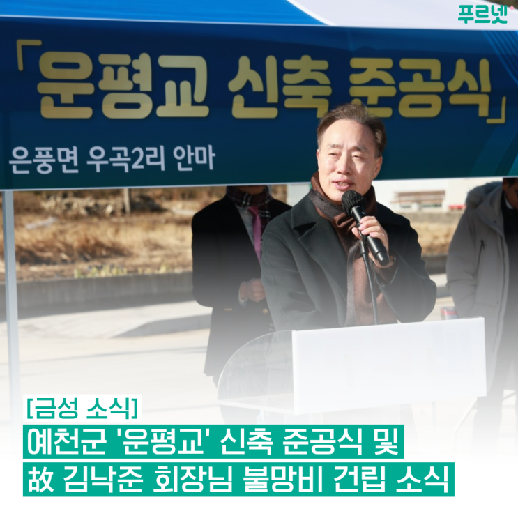 안녕하세요. 금성출판사 푸르넷입니다! 지난 12일(금) 예천군 은풍면 우곡2리에서 <운평교 신축 준공식>이 개최되어 뜻깊은 소식을 널리 알려드리고자 합니다! 2025년 4월 전해 드렸던 소식, ‘故 김낙준 금성출판사 선대 회장 추념패 헌정식’ 기억하시나요? 故 김낙준 선대 회장님께서 어린 시절을 보낸 우곡2리의 안전을 위해 건설했던 ‘운평교’ 2023년 수해로 인해 운평교를 철거하고 새로운 다리 건설을 추진 중이라고 전해드렸는데요. 2025년 12월, 드디어 ‘운평교’가 신축 준공되었습니다! 많은 분들이 준공식에 참여하셔서 자리를 빛내주셨는데요. 테이프 커팅식과 무사를 기원하는 고사를 통해 ‘운평교’의 새로운 시작을 알....... <img src="https://blogthumb.pstatic.net/MjAyNTEyMjNfNjUg/MDAxNzY2NDQ5Nzc0NjQ5.BcGba0LEj3jMO-_-nUqXCBphmW7BIGTNL7RvoKzF5p8g.UiJTmL9qGOMCY_ijYx1M_NaqFxZ36IPRsxWOa-QUUHAg.PNG/%BA%ED%B7%CE%B1%D7%BF%EB_%BD%E6%B3%D7%C0%CF.png?type=s3" />