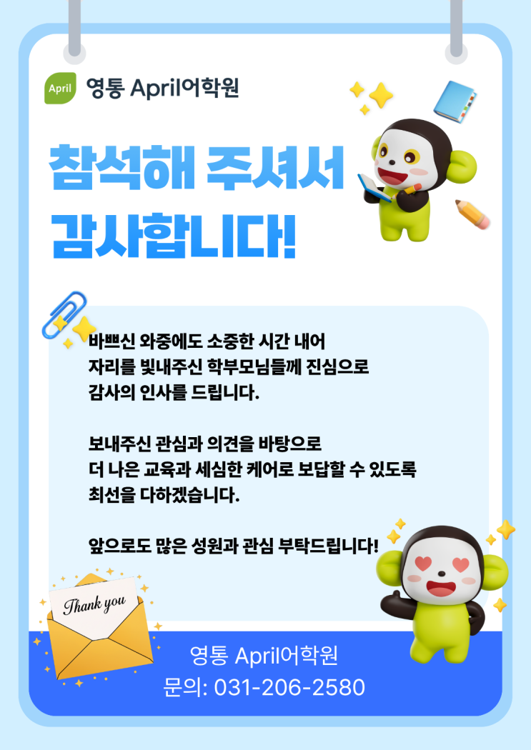 안녕하세요 영통 April어학원입니다. 최근 진행된 학부모 간담회에 바쁘신 일정 속에서도 시간을 내어 참석해주신 모든 학부모님들께 진심으로 감사드립니다. 이번 간담회는 아이들의 현재 학습 상태를 함께 점검하고, 앞으로의 방향을 보다 구체적으로 안내드릴 수 있었던 매우 뜻깊은 시간이었습니다. 단순한 설명을 넘어 학부모님들과 직접 소통하며 아이 한 명, 한 명의 학습 고민과 성장 방향을 함께 나눌 수 있어 더욱 의미 있었습니다. 특히, ✔ 레벨별 학습 로드맵 ✔ 영어 실력 향상을 위한 핵심 포인트 ✔ 실제 수업 운영 방식과 관리 시스템 등을 자세히 안내드리며 보다 신뢰할 수 있는 교육 방향을 공유드릴 수 있었습니다. “아이....... <img src="https://blogthumb.pstatic.net/MjAyNjA0MDNfNzUg/MDAxNzc1MjEyNTY1ODQ5.ObWF7QXHqkbbkJ5xuT3TySMhvf3XlkQsv3j62KpVJ_sg.Xe06AsruvYvi-DCTwur61aD4MXUYI3mo9llZW8BNFYog.PNG/%C7%D0%BA%CE%B8%F0_%B0%A3%B4%E3%C8%B8-_%BA%B9%BB%E7%BA%BB.png?type=s3" />