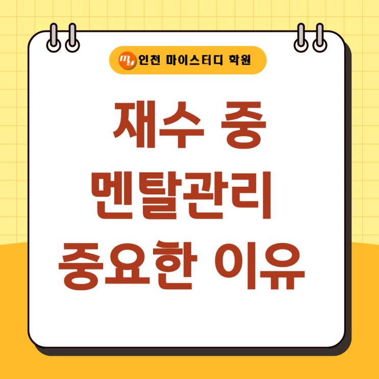 재수 중 멘탈 관리가 성적보다 중요한 이유 안녕하세요 인천마이스터디학원입니다 재수를 결심할 때 대부분은 이렇게 생각합니다. “이번엔 공부량을 늘리면 되겠지.” 하지만 실제 재수 현장에서 성적을 가르는 결정적인 요소는 공부 방법보다 멘탈 관리인 경우가 훨씬 많습니다. 왜일까요? 재수생이 가장 먼저 무너지는 건 ‘의지’가 아니라 ‘정신력’ 재수는 단기간 승부가 아닙니다. 최소 10개월 이상 같은 공간, 같은 책상, 같은 목표를 반복해야 하는 생활입니다. 이 과정에서 많은 학생들이 겪는 공통적인 문제는 다음과 같습니다. 초반 의욕 → 중반 슬럼프 → 후반 불안감 * 주변 재수생 성적에 대한 비교 * 작은 성적 하락에도 크게....... <img src="https://blogthumb.pstatic.net/MjAyNjAyMDlfNjcg/MDAxNzcwNjI5NjY1MTkw.1CxTv4tiUjonRb-5MKqNPKSvgpqi3JOv4LsYT6XBiqAg.LDN_rKE3flp9ZXLGATqggp7b0L-wdlj_-G2om3cPtxEg.PNG/%C1%A6%B8%F1%C0%BB_%C0%D4%B7%C2%C7%D8%C1%D6%BC%BC%BF%E4._%287%29.png?type=s3" />