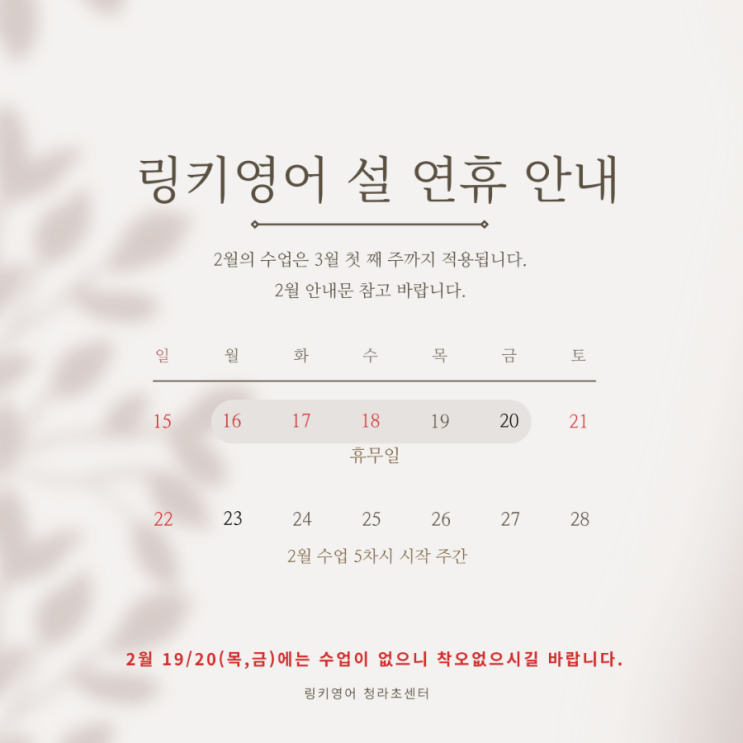 안녕하세요 링키영어 청라초센터점 원장 Laura입니다~ 2026년 설 연휴 안내드립니다. 링키영어 청라초센터점은 매월 8차시/12차시 수업으로 규정을 지킵니다. 2월 19,20일(목. 금)에는 수업이 없으니 착오 없으시길 바랍니다^^ 또한 3월 첫째 주까지는 2월 수업이며 3월 둘째 주부터 3월 1차시 수업입니다. 아래 2월 안내문 참고 행복 가득한 설 연휴 보내시기 바랍니다~^^ <img src="https://blogthumb.pstatic.net/MjAyNjAyMTFfMTAw/MDAxNzcwNzcyMTY4MDQw.4olF2ShvklYJvx3lJhKx8bhWoFeg8teaKX4meBUCEtEg.UcW0kQRHKjOKmNokWdH0iXzv8cG3m_1TXyYOrykPyHwg.PNG/900%A3%DF1770772092330.png?type=s3" />
