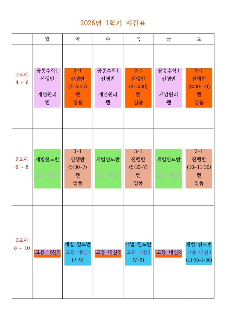 어느덧 겨울방학 특강도 후반에 접어 들었네요! 3월부터 시작하는 1학기 시간표를 안내드립니다. 보다 자세한 사항은 학원(747-1737)으로 문의주세요^^ <img src="https://blogthumb.pstatic.net/MjAyNjAyMTFfOTkg/MDAxNzcwNzc1ODI4ODg4.WYi4u9KO3WGkQC2H2_wz4tBnkAUlXjWOxa0kJ0ffCLkg.Vh2xHEEW90xm81jKuYZkTKTXz2HxhBJ9TfThKQrCOdcg.JPEG/2026%B3%E2%B5%B5_1%C7%D0%B1%E2_1001.jpg?type=s3" />