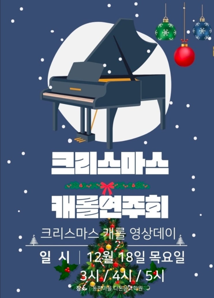 안녕하세요 새해의 시작이 엊그제 같은데 어느덧 2026년을 맞이할 시간이예요. 동편마을 다온음악학원은 올해에도 따뜻한 음악인들을 양성하기 위해 사랑으로, 정성으로 지도하며 다온학원생들이 음악적으로 성장하는 풍성한 열매들을 맛보는 2025년이 되었어요!!! 이는 변함없이 다온음악학원 믿고 보내주시고, 많은 관심과 애정으로 격려를 보내주신 학부모님이 계셨기에 가능했어요. 깊은 감사의 인사를 드립니다 내년에도 변함없는 사랑과 열정으로 지도하며 올 한 해보다 한 걸음 더 깊이있는 성장이 있도록 진심의 마음을 담아 최선을 다하겠습니다! ✅️12월 학원행사일정 안내드려요. 크리스마스 캐롤 연주회 (캐롤 영상데이....... <img src="https://blogthumb.pstatic.net/MjAyNTEyMDhfODQg/MDAxNzY1MTIzNjc1MTQy.scgGUhJjKGBLHcptAm-l_eLozGaWhybKDi-8-xzD1V4g.x7j3NJbZ0rZEWu5z0t5f4vV-_PjfYNroafGoH_eYqCIg.JPEG/900%A3%DFScreenshot%A3%DF20251208%A3%DF010733%A3%DFBAND.jpg?type=s3" />