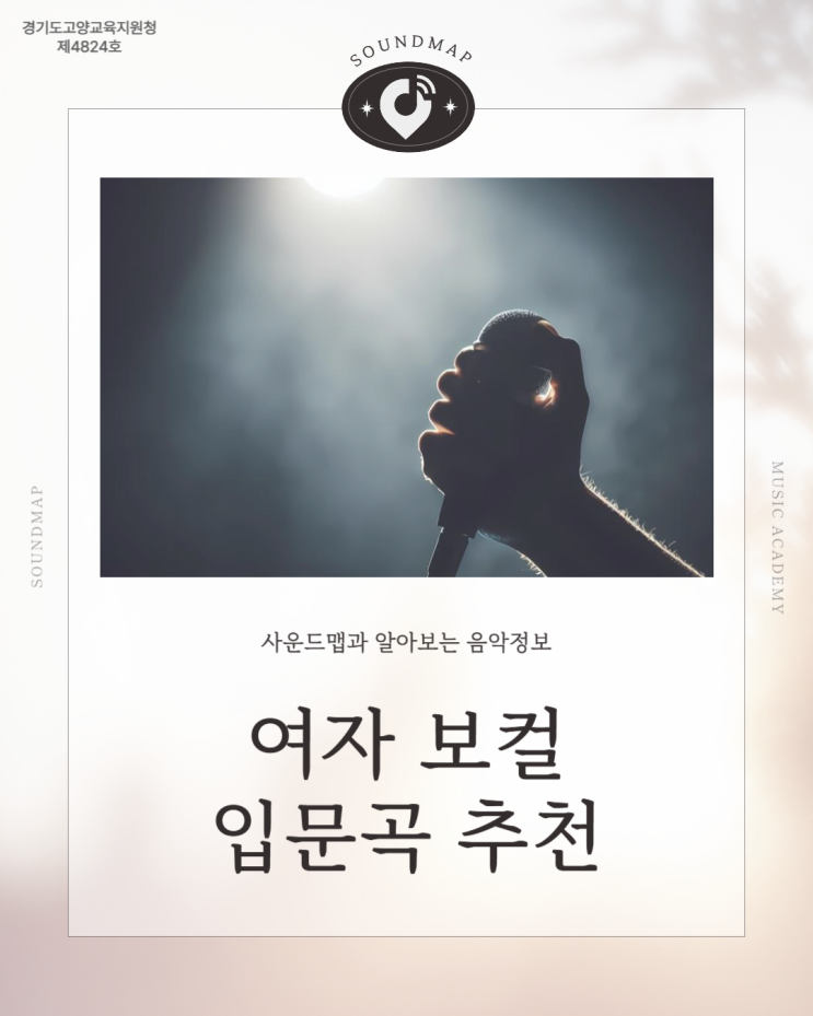 여자 보컬 입문곡 추천 안녕하세요~ 일산 탄현 실용음악학원 사운드맵실용음악학원입니다~!! 사운드맵실용음악학원에서는 보컬, 피아노, 기타, 베이스, 드럼, 작곡, 미디 등 다양한 과목을 수강하실 수 있는데요~ 오늘은 그중에서도 '보컬'과 관련된 음악정보를 소개해 드리려고 합니다!! 보컬을 처음 시작하는 분들이라면 누구나 한 번쯤, '나에게 맞는 첫 곡이 뭘까?' 하는 고민을 하실 것 같습니다! 그런 의미에서, 오늘은 여자 보컬 입문자분들께 어울리는 추천곡들을 추천해 드리려고 하는데요 아무리 좋은 목소리를 가지고 있어도, 처음부터 너무 어렵거나 고음이 많이 필요한 곡을 선택하면 자신감을 잃기 쉽죠! ....... <img src="https://blogthumb.pstatic.net/MjAyNTEwMTNfMjU2/MDAxNzYwMzU2OTMyMTk0.rbFZJNr1fGn9uSLvMaoaJFFDbgXPhCwje59IItQwK1Ag.LHOhqoNbAc3eNSQAT2S-cHwLiAKNUKEykWYvocZXywUg.PNG/001.png?type=s3" />