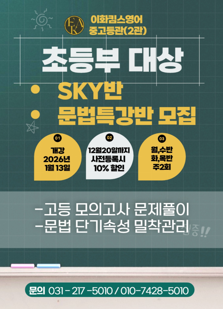 안녕하세요, 이화킴스영어입니다. 이번 겨울방학을 맞아 초등 고학년 대상 단기 속성 문법 특강, 그리고 초등부 고등과정 스카이반을 모집합니다. 자세한 일정과 커리큘럼은 곧 안내드릴 예정이니 많은 관심과 참여 부탁드립니다! <img src="https://blogthumb.pstatic.net/MjAyNTExMThfMTY4/MDAxNzYzNDI0NjU5Mjgw.Wt4O5zVN2C8ybVwuj4fpqiAiPpkqbVGZlJ4VF3Zvgxwg.Ad1aapOf3oZLP86-cTDZE4-a8MU4UkXCiRUMPF77M6Yg.PNG/KakaoTalk_20251118_090521677.png?type=s3" />