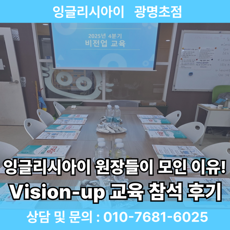 안녕하세요~ 광명초 영어학원 잉글리시아이 광명초점 Mia 쌤 입니다. 오늘은 vision-up 교육 참석 후기를 담아보려고 합니다. 원장으로서 늘 "아이들에게 더 나은 수업을 어떻게 제공할 수 있을까?" 고민하게 되는데, 매 분기별 진행되는 비전업 교육은 그 질문에 대한 방향을 바르게 잡아주는 유익한 시간입니다. 비전업 교육, 왜 꼭 참석해야 할까요? 잉글리시아이 가맹점이라면 모두 참석하는 필수교육이며, 단순한 교육이 아니라 브랜드의 비전·교육방향·운영전략을 아주 깊이 있게 배우는 자리입니다. 저 역시 운영을 하다 보면 교육방향에 대해 고민이 깊어지기 마련인데요, 이번 교육을 통해 다시 한 번 학원의 정체성과 목표를....... <img src="https://blogthumb.pstatic.net/MjAyNTExMzBfMTM3/MDAxNzY0NDc4MTk2NjAy.7CNMueGCzGYyMVb_MxPXrfugow-4j3LvSDhPKhXVYf0g.kqfQDNEhI3wCNk7xd9nAdt_xuYDdcrY3gbPFhtBrssog.PNG/%C1%A6%B8%F1%C0%BB-%C0%D4%B7%C2%C7%D8%C1%D6%BC%BC%BF%E4__%BA%B9%BB%E7%BA%BB-_3_-001_%288%29.png?type=s3" />