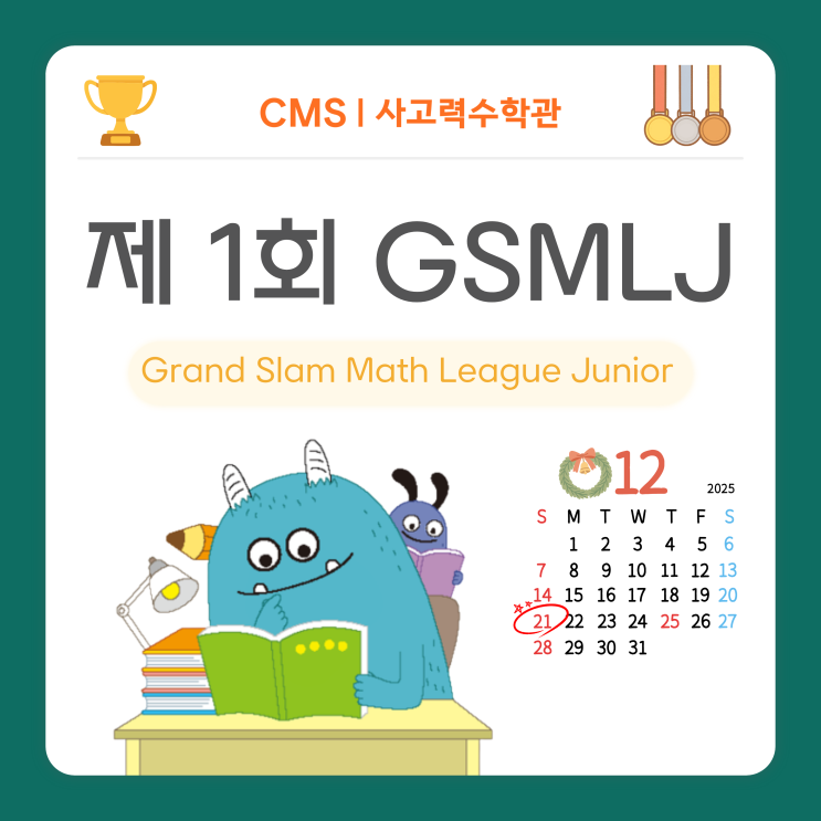 안녕하세요~ CMS 분당수내 사고력수학관입니다. 다가오는 겨울, 아이들의 사고력을 한 단계 성장시킬 GSMLJ 대회가 진행됩니다. GSMLJ는 단순한 계산 중심의 수학 시험이 아닌, 스스로 생각하고, 추론하고, 탐구하는 힘을 확인하는 사고력 중심의 평가입니다. < GSMLJ는 어떤 대회인가요? > GSMLJ는 창의·논리·추론 능력을 다양한 유형의 문제를 통해 측정하는 사고형 평가입니다. 단순 연산 방식의 평가가 아닌 다양한 수학적 능력을 평가하는 융합형 최상위 수학능력평가 대회입니다. < 대회 일정 > GSMLJ 대회는 단순히 결과를 확인하는 시험이 아니라, 아이의 사고력 성장과 학습 방향을 함께 고민할 수 있는 의미 있는 경험입니....... <img src="https://blogthumb.pstatic.net/MjAyNTEyMDFfNTcg/MDAxNzY0NTczNzY1ODM5.azl0fu_oPvqrWsu_O4-cSDesG4kBM9NF8N7w2rkuhI0g.YfR03qnsFqp631GfXhMmBFWNqqpm9d6q4plsYa5zuLkg.PNG/1.png?type=s3" />