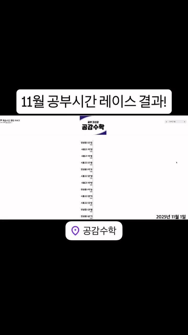 [시흥고 내신준비] 2025년 11월 공감수학 학습시간 레이스 결과 발표!