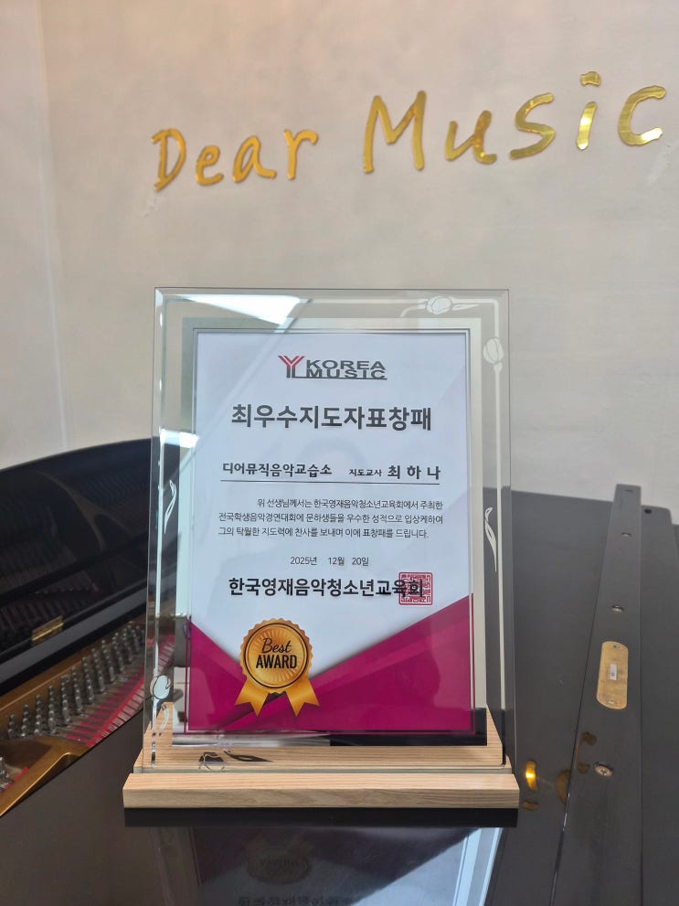 안녕하세요 "즐겁게, 정확하게 배우는 피아노" 디어뮤직입니다~ 이번 하반기 콩쿨들을 준비하면서 했던 노력들을 아시기라도 하듯이 감사하게도 표창패를 보내주셨어요ㅜㅜ 감사합니다♥ 다 우리 디뮤둥이들이 선생님을 믿고 잘 따라와주고 노력해 준 덕분이라고 생각해요~ 내년 상반기때도 화이팅!! <img src="https://blogthumb.pstatic.net/MjAyNjAxMTNfMjYx/MDAxNzY4Mjg3NjM4MTY1.cZsMMN3Kc2HnPycQ6P4QF0SiFge7yCJAmfXHrQ85LXwg.Qr6opTXWk0TpKn8VoZZq4RYUCo_w3MLiZKa2mkklOTog.JPEG/KakaoTalk_20260113_155859610.jpg?type=s3" />