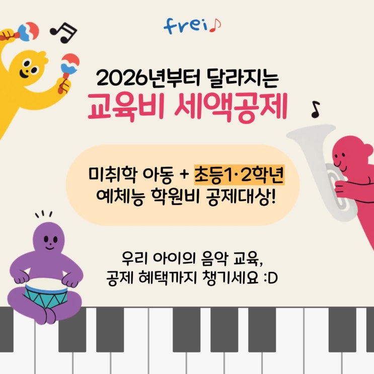 2026년부터 달라지는 교육비 세액공제, 꼭 확인하세요! 올해부터는 미취학 아동뿐만 아니라 초등학교 1·2학년 자녀까지 예체능 학원비가 교육비 세액공제 대상에 포함됩니다. 자녀 1인당 연간 예체능 학원비 지출액에 대해 15% 세액공제가 적용되어 연말정산 시 실제 세금 부담을 줄일 수 있습니다. (올해 100만원을 썼다면 내년 연말정산으로 15만원을 돌려받을 수 있습니다.) 음악 교육, 특히 이 시기에 시작하면 좋은 이유 미취학~초등 저학년 시기는 아이의 감각·두뇌·정서 발달이 가장 빠르게 이루어지는 시기입니다. ✔ 리듬과 소리를 통해 집중력·기억력·패턴 인식 능력이 자연스럽게 발달하고 ✔ 손과 몸을 함께 쓰는 활동으로....... <img src="https://blogthumb.pstatic.net/MjAyNjAxMTRfMjc5/MDAxNzY4MzY4NzY4MzQ4.hdifTRXhq7zRU5LqyJfflIwpNdt6ktdjUNxvbUzvhSUg.xu6K2dqEBJkJ4cfnSyVcN-YZkaEZHWiTCd3mqKkaN8og.JPEG/2026%B3%E2%BA%CE%C5%CD_%B4%DE%B6%F3%C1%F6%B4%C2_%B1%B3%C0%B0%BA%F1_%BC%BC%BE%D7%B0%F8%C1%A6.jpg?type=s3" />