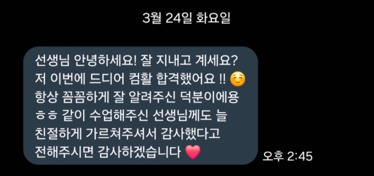 우리 다정 다감한 수강생들~^^ 이 좋은 봄날에 합격문자 자꾸자꾸 보내주셔서 너무나 감사합니다. 이 맛에 수업합니다!!! 꽃길만 가득하기를 바랍니다~♡ <img src="https://blogthumb.pstatic.net/MjAyNjAzMjRfMjc3/MDAxNzc0MzM1NDkzOTQw.r_mo6Y0GUyWAyAL5-J_kALdD_eVLev1M_uYUGQgUOTAg.RiuksqGJQJO-VGOm0m3aSSiTBWD-wuwaxcRT6Zby4wcg.JPEG/900%A3%DFScreenshot%A3%DF20260324%A3%DF155601%A3%DFMessages.jpg?type=s3" />