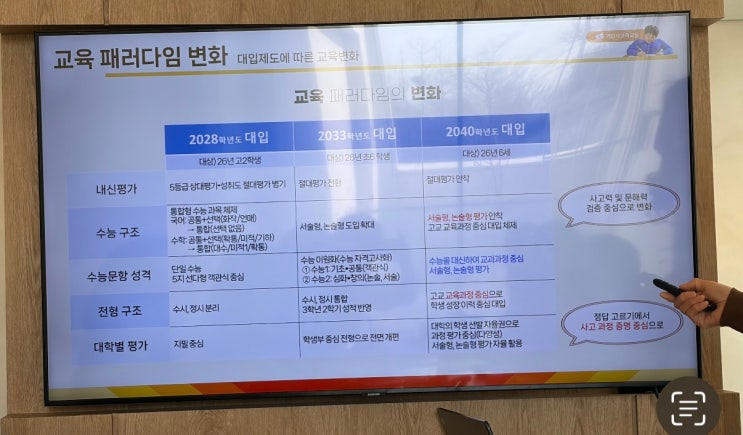 안녕하세요. 오랜만에 인사드립니다. 1. 변화하는 입시정보 2. 발 빠른 입시정보로 접근한 초등교육 3월은 신학기라.. 시간이 정말 쏜살같이 지나가더라고요. 너무 정신없는 시즌임에도 변화하는 입시정보를 전달하고자 글을 적어봅니다. 서울 원장님의 교육모임, 대구 수성구 원장님들의 세미나에 꼭 참석하여, 회의를 통해 많은 고급 정보들을 입수하였습니다. 1. 변화하는 입시정보 확정된 입시교육이 드디어 오픈됨으로써, 사교육 시장에서도 많은 변화가 있을 예정입니다. 26년을 기준으로 2033년 대입은 초등 6학년부터 시행이고요. 2040년 대입은 현재 7세 유치부부터 적용됩니다. 내신 평가의 기준이 절대평가로 바뀐다는 건 .. 각 학교....... <img src="https://blogthumb.pstatic.net/MjAyNjAzMzFfMTky/MDAxNzc0OTQ1OTY5NTY4.CTIUkKeS15GSkhkH0kAD6IYAGAmSQdUINU2nRFRBJ70g.8NlnDLJMqrGAlkgqo4kxX98OID9WVmzKU8JltISWJtAg.JPEG/%B1%B3%C0%B0_%BA%AF%C8%AD.jpg?type=s3" />