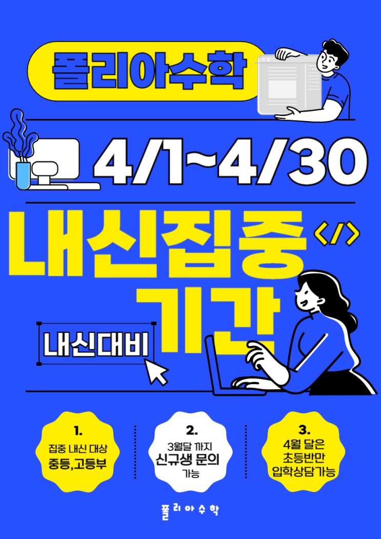 폴리아 수학 2026 1학기 내신대비 시작 안녕하세요 폴리아 수학 학원 입니다. 2026년이 시작된 지 얼마 되지 않은 것 같은데, 어느덧 1학기 중간고사가 다가오며 내신 대비가 본격적으로 시작되었습니다 ,, 하지만 우리 학생들이 폴리아 선생님들을 믿고 꾸준히 따라온다면 2026 첫 내신도 분명 좋은 결과로 이어질 것입니다! 현재 학생들은 학원에서 제공하는 자체 제작 교재를 활용하여 개념 정리부터 문제 풀이, 서술형 대비까지 체계적으로 학습을 진행하고 있습니다. 특히 이번 내신 대비에서는 단순한 문제 풀이를 넘어 풀이 과정과 사고력까지 함께 잡는 것을 목표로 하여 학생 개개인의 수준에 맞춘 지도를 진행하고 있습니다. 또한, 오....... <img src="https://blogthumb.pstatic.net/MjAyNjA0MDFfMTgx/MDAxNzc1MDQwNjE3MDgx.q8nscX-XS1TKiSGk95Qdk7c2pMoEQmNyhKQK-aw1JWIg.GN5HPR1qpK0W22-9N9KsKDz7u1wMecRx2f8xzFmOG94g.PNG/4%3F%9B%94%3F%82%B4%3F%8B%A0%3F%3F%EB%B9%84%EC%83%81%3F%8B%B4-001.png?type=s3" />