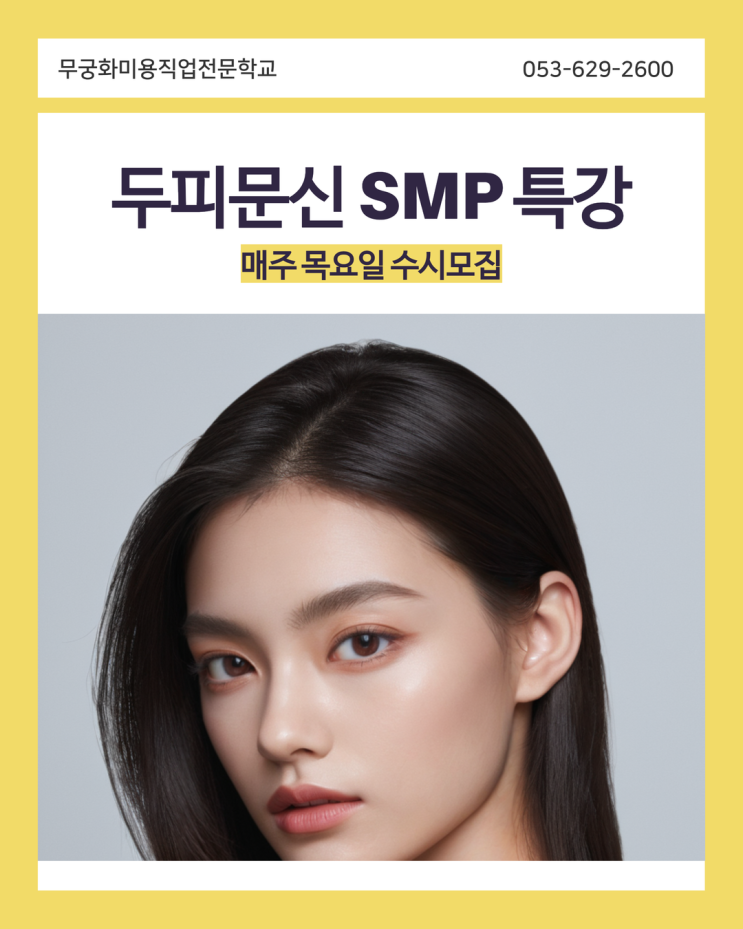 두피문신 smp 특강 안내 매주목요일 진행되는 smp 특강! 평소 두피문신,관리,smp에 관심있으셨분들은 매주 1회 특강으로 부담없는 수강이 가능합니다 빠른수강문의 대구무궁화미용직업전문학교 달서점 053-629-2600 <img src="https://blogthumb.pstatic.net/MjAyNjA0MDFfMjQx/MDAxNzc1MDI2MDgxMjA2.Em0MiwlT_utZsXvf1-POu3k8OoNyc9_Ea3on6qIx0WIg.EznO7AAragq9NPYOXkMzwAKY_YJXTq9YGbHCrG9xGdUg.PNG/%C0%CE%BD%BA%C5%B8%C7%C7%B5%E5.png?type=s3" />