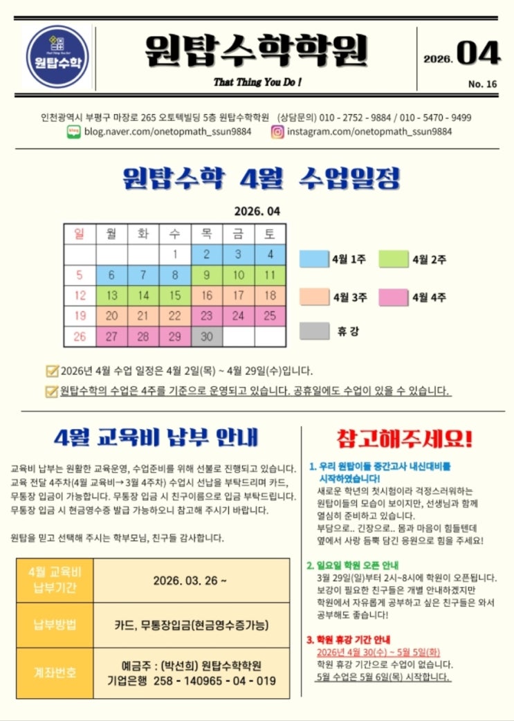 4월 수업일정입니다~ 내신대비 시작! #부평구수학학원 #산곡동수학학원 #내신대비는 원탑 #3월 수업일정 #원탑 <img src="https://blogthumb.pstatic.net/MjAyNjA0MDJfMTYz/MDAxNzc1MTI1NzYzMzU2.oBxbY_hzRrdIovWpyO7yiHtlUK16_cDLFNm4or2nBiog.FOMjPkAzjk4UXDDBamse-JFQTgVDNi_doO_5ATDzqPUg.JPEG/900%A3%DF1774600755459.jpg?type=s3" />