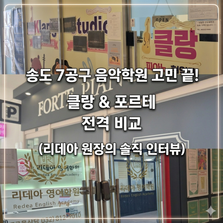 안녕하세요! 송도 7공구 리데아(REDEA) 영어학원 Sophia 원장입니다. "영어 수업 끝나고 바로 옆 음악 학원 가면 되나요?" 상담을 하다 보면 어머니들의 가장 큰 고민 중 하나가 바로 아이들의 '학원 동선'이에요. 한 상가 내에서 안전하게 영어 공부와 예체능을 마칠 수 있다면 얼마나 좋을까 하는 간절한 마음이죠. 리데아가 있는 송도 7공구 아메리칸타운 상가 2층에는 다행히 실력 있는 음악 교습소가 두 곳이나 있습니다. "어디가 우리 아이랑 더 잘 맞을까?" 고민하시는 분들을 위해, 제가 이웃 원장님들을 직접 만나 인터뷰하고 왔습니다! 저희 학원 문을 열고 나서면 바로 만날 수 있는 순서대로, 우리 아....... <img src="https://blogthumb.pstatic.net/MjAyNjA0MDRfMjIg/MDAxNzc1MjU3OTkwMDk3.QiwX_IJ__y1n0Egf3PqsxQyPZVsDqpOAk_mMV0oX9qog.DAdGIc6yf1WHGdmm4pf_pn4is9GH9RVhcWscegtknfQg.PNG/%BA%ED%B7%CE%B1%D7%BD%E6%B3%D7%C0%CF.png?type=s3" />