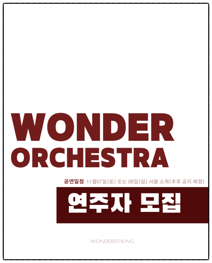 WONDER ORCHESTRA에서 함께 연주하며 음악의 즐거움을 나눌 단원을 모집합니다. 열정 있는 연주자 여러분의 많은 지원을 기다립니다. 원더스트링 오케스트라는 클래식과 대중음악을 아우르는 다양한 레퍼토리를 편곡된 버전으로 연주하는 취미 연주 중심의 오케스트라입니다. 이번 시즌에는 현악, 관악, 타악까지 한 자리에 모여 처음으로 필하모닉 편성으로 함께 연주하는 무대를 준비했습니다. 클래식 명곡부터 익숙한 대중음악까지, 다양한 프로그램으로 지루함 없이 음악을 즐길 수 있도록 구성했습니다. 연주 경험이 많지 않은 분들도 함께할 수 있도록 난이도를 고려한 악보를 준비했으니, 음악을 사랑하는 분이라면 누구나 부담 없이 원더....... <img src="https://blogthumb.pstatic.net/MjAyNjAzMTZfODAg/MDAxNzczNjQ3NTgwMDIw.N5BxGWyL_G30citdhXKcn_DlLVfNtuOLbGFngoRaQjsg._17ESF394X5_CvVwZaCeXZ9NMWSCSPwTJHbYEpzzp9cg.PNG/KakaoTalk_20260316_165156417_03.png?type=s3" />