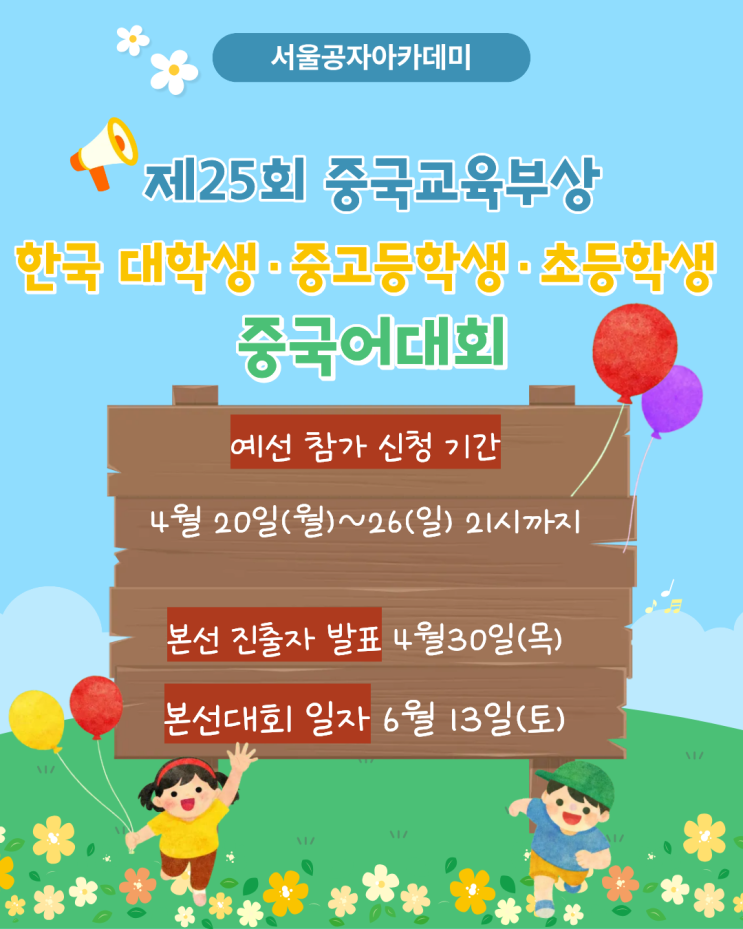 제25회 중국교육부상 한국 대학생 ▪중고등학생 ▪초등학생 중국어대회 예선 참가 신청 기간 4월20일(월)~4월26일(일) 21시까지 본선 진출자 발표 4월30일(목) 본선대회일자 6월13일(토) 중국어를 배우는 여러분에게 중국어 실력을 펼칠 수 있는 가장 큰 무대가 올해도 찾아옵니다. 매년 수많은 학생들이 참여하며 각 부문별 "대상" 수상자에게는 "한어교" 세계중국어대회에 한국 대표로 출전할 수 있는 기회가 주어지는 국내 가장 권위있고 규모있는 대회! 예선 참가 신청 기간을 안내해 드립니다. 여러분의 참여가 중국어 학습의 새로운 전환점이 될 수 있습니다. 제25회 중국교육부상 한국 대학생▪중고등학생▪초등학생....... <img src="https://blogthumb.pstatic.net/MjAyNjAzMTdfMTEw/MDAxNzczNzA3ODkwNTYw.qLlPqhTPhrofj_jHCKQvCDy7my6tTVF3bFsPFwJ5YA4g.8gEaPK6ZU7bQyhsw2U9Z5IqNVYa9z_0T3XAMK3lwiQkg.PNG/1.png?type=s3" />