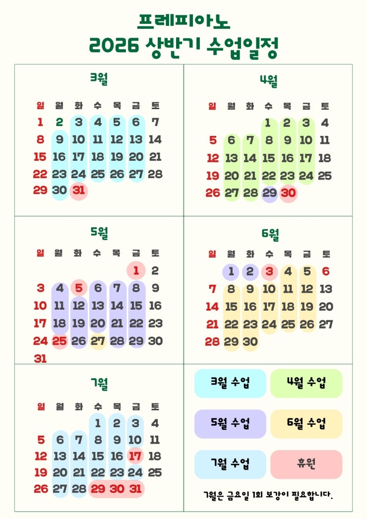 안녕하세요, 프레피아노입니다 2026년 상반기 수업안내드려요. 월 4회 / 8회 / 12회 수업횟수를 보장하며 5주차는 휴원하고 있습니다. 3월 31일 화 / 4월 30일 목 / 5월 1일 금 7월 29-31일 수-금 은 5주차로 쉬어갑니다. 7월 17일 제헌절이 공휴일이 되면서 7월 금요일 등원생은 1회 보강이 필요합니다. 〰️〰️〰️PREPIANO〰️〰️〰️ PREMIER / PRECIOUS / PRESENT 최고의 수업으로 소중한 선물이 될 프레피아노입니다. 유아 | 초급 | 중급(체르니100,30) | 고급(체르니40 이상)네 과정을 체계적으로 수업합니다. 상담은 수업시간 외에만 이루어집니다. 아이들의 소중한 수업시간을 위해 꼭 예약 후 방문해주세요 ▫주 1회 / 2....... <img src="https://blogthumb.pstatic.net/MjAyNjAzMTdfMjE0/MDAxNzczNzIyMzA1NTA2.AEeODtBEhoNx-aC9iR2922PhDaYRBSUKFPGwXHrV5MIg.h9yKCWzRmYOkl2R_O0jmQVKus6ZA2CK6urdPxTAuIEwg.JPEG/740%A3%DF%B3%EC%BB%F6_%C8%B8%BB%F6_%BD%C9%C7%C3%C7%D1_2026_%BF%AC%B0%A3_%B4%DE%B7%C2_%C6%F7%BD%BA%C5%CD%A3%DF20260310%A3%DF134502%A3%DF0000%A3%DF260310%A3%DF135016.jpg?type=s3" />