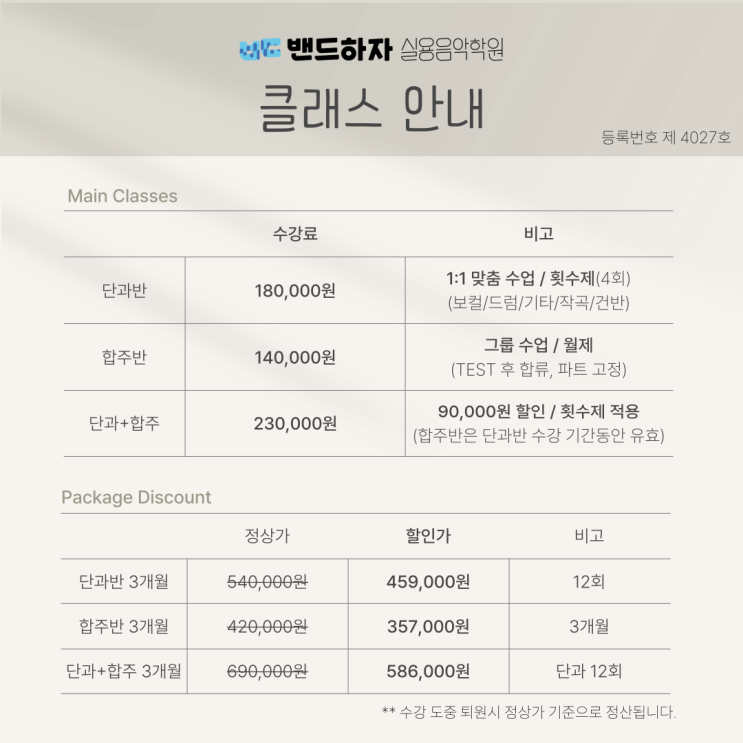 안녕하세요! 밴드하자 실용음악학원입니다. 3월의 설렘이 익숙함으로 변해가는 지금은 아이들이 새로운 악기에 도전하며 올바른 연습 습관을 잡아주기에 가장 좋은 시기입니다. 저희 학원은 기존 '플레이키즈밴드'에서 '밴드하자'로 이름을 변경하며, 초등학생뿐만 아니라 중고등학생과 성인분들까지 음악으로 소통하는 공간으로 거듭나고 있습니다. '키즈'라는 틀을 벗어나 더 깊이 있는 음악 활동을 지향하는 밴드하자의 특별한 시스템을 소개합니다. 밴드하자만의 확실한 연습 도구: "오픈클래스" 많은 분이 "주 1회 레슨만으로 실력이 늘까요?"라고 걱정하십니다. 저희는 수년간 연습실을....... <img src="https://blogthumb.pstatic.net/MjAyNjAzMTlfNzAg/MDAxNzczODQ5Nzk5ODc3.WEzOnrAsM5SheQfZhYYVyZt2A-fVeBm6RqgWpIBeifkg.WKSBfVr1y3GHybol48zjYA880nAV9vfEEFI5ZeOIHMMg.PNG/001.png?type=s3" />
