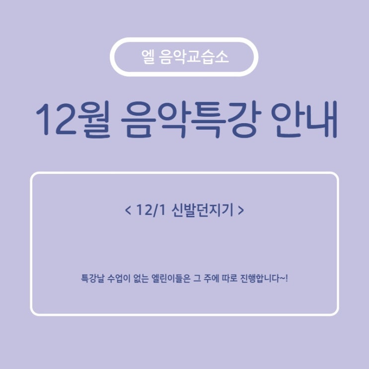 안녕하세요~엘티처입니다 :) 어젯밤 내린 눈으로 많은 분들이 퇴근길에 힘드셨을 것 같아요ㅠ 오늘 출근길도 만만치 않으셨을 텐데 모쪼록 안전한 하루 보내시길 바랍니다 이번 시간은 12월 일정에 대해 안내드립니다~ 음악 특강 이번 달은 크리스마스 음악회 관계로 1번의 특강만 진행합니다~ 크리스마스 음악회 예정대로 12.23-24일에 원에서 진행하며 음악회 뿐만 아니라 즐거운 파티와 함께 올해의 마지막을 신나게 장식해 보겠습니다 겨울 방학 12.30-31일은 엘 피아노의 겨울 방학입니다 :) 행복한 방학 보내길 바라며 저도 잠시 쉬며 내년을 준비하는 시간을 가집니다~ 마음 따뜻하고, 웃음 가득한....... <img src="https://blogthumb.pstatic.net/MjAyNTEyMDVfMjcz/MDAxNzY0ODk3ODQ5MDEz.vYZhhrDAN_oacUFvCIFs7mbVri81RfXAZ-HRADwFjp8g.l5H7XcberIKLTk2s1RBZhKv4yukuztdNTUYvWmc9UmEg.JPEG/IMG%A3%DF6179.JPG?type=s3" />