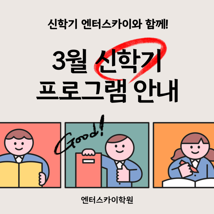 새 학기, 새로운 도전이 시작됩니다 겨울방학 특강을 성실히 마무리한 예비 고1·고2·고3 여러분, 정말 수고 많았습니다 이제 3월부터는 학교별·학년별 정규 수업이 본격적으로 시작됩니다. 지금은 새로운 출발선에 선 시기입니다. 이 시기의 방향 설정이 1년, 더 나아가 3년의 결과를 바꿉니다. 엔터스카이학원은 학년별 상황에 맞춘 전략으로 신학기를 준비합니다. 고1, 첫 단추가 가장 중요합니다 고1은 입학과 동시에 학습, 동아리, 교내 활동까지 한 번에 시작됩니다. 처음부터 흔들리지 않도록 학습 루틴을 잡는 것이 무엇보다 중요합니다. ✔ 미리 계획 세우기 ✔ 학교별 진도에 맞춘 내신 대비 ✔ 과목별 기초 개념 점검 특히 공통과....... <img src="https://blogthumb.pstatic.net/MjAyNjAyMjNfMTY5/MDAxNzcxODIzNTYzNjI5.dL6MPLh5DNpXnGlAOUt7cd18PIwofsglBMpU4Ds_f8Ug.AELqZuT23lB_hFmTPnuDo2zC0ACSsSWu5AP-Ya81Py8g.PNG/%B0%C7%BF%EC-%C5%DB%C7%C3%B8%B4-001.png?type=s3" />