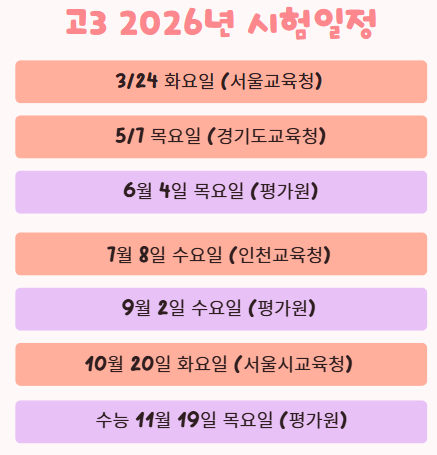 안녕하세요~ 오늘은 2026년 모의고사 일정을 알아보겠습니다. 먼저 고3부터 알아보겠습니다. 27년에 입학을 하게되니까 고3은 2027학년도 수능이라고 표현합니다. 하지만 연도보고 헷갈리지않게 올해 시험치는 날짜로 올립니다^^ 수능이 이번엔 19일이군요! 수학은 선택과목 때문에 시험 범위가 9월이 되서야 전범위가 되는데요. 3월달은 선택과목의 범위가 너무 짧아서 문제가 집약적인 문제들이 많이 나옵니다. 현실이랑 참 맞지않지만 시험 범위도 올려봅니다. 고3 일정과 범위에 대한 내용 끝입니다. 고2일정 알아보겠습니다. 고2들 교육과정 바뀌고 처음으로 치르는 고2 과정이죠! 대수 미적분1이 공통이니까 지금부터 모의고사를 잘 준비해....... <img src="https://blogthumb.pstatic.net/MjAyNjAxMjVfMjU0/MDAxNzY5MjY3MjI4NTEw.NllHlJ4synnF1KBJGxeghA0ikpAz235D1rGTvWPdLBgg.ANXsXgUbIrckbaKLNB8LJSfNbqDMLJvwlKh7_l2p8uIg.PNG/image.png?type=s3" />